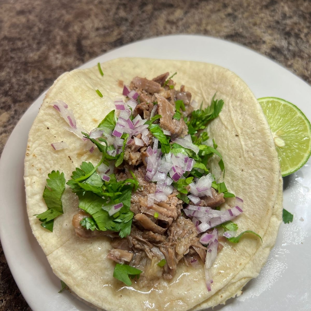 1 taco de carne de cabeza de res con doble tortilla de maiz acompañada de salsa y verdura picada
