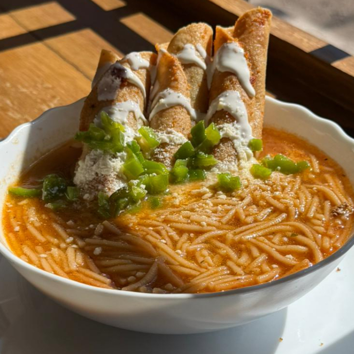 Sopa de fideo acompañado de 3 flautas de carne y papa