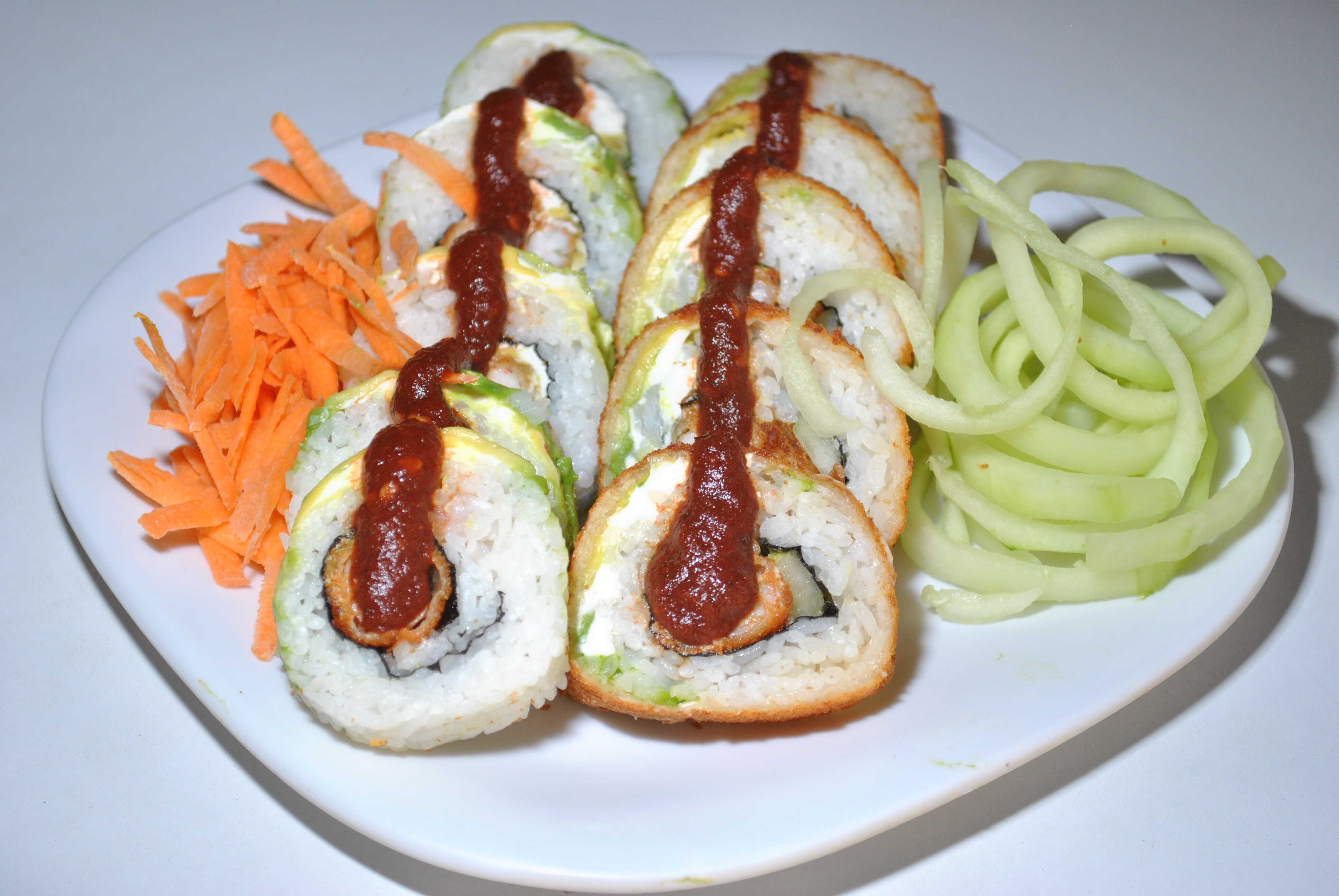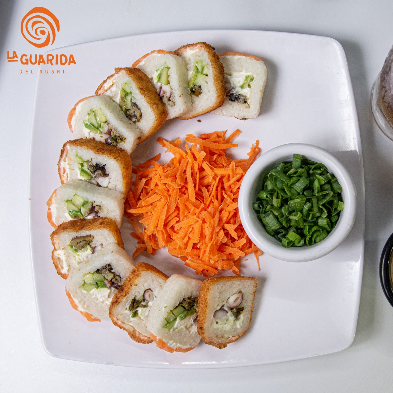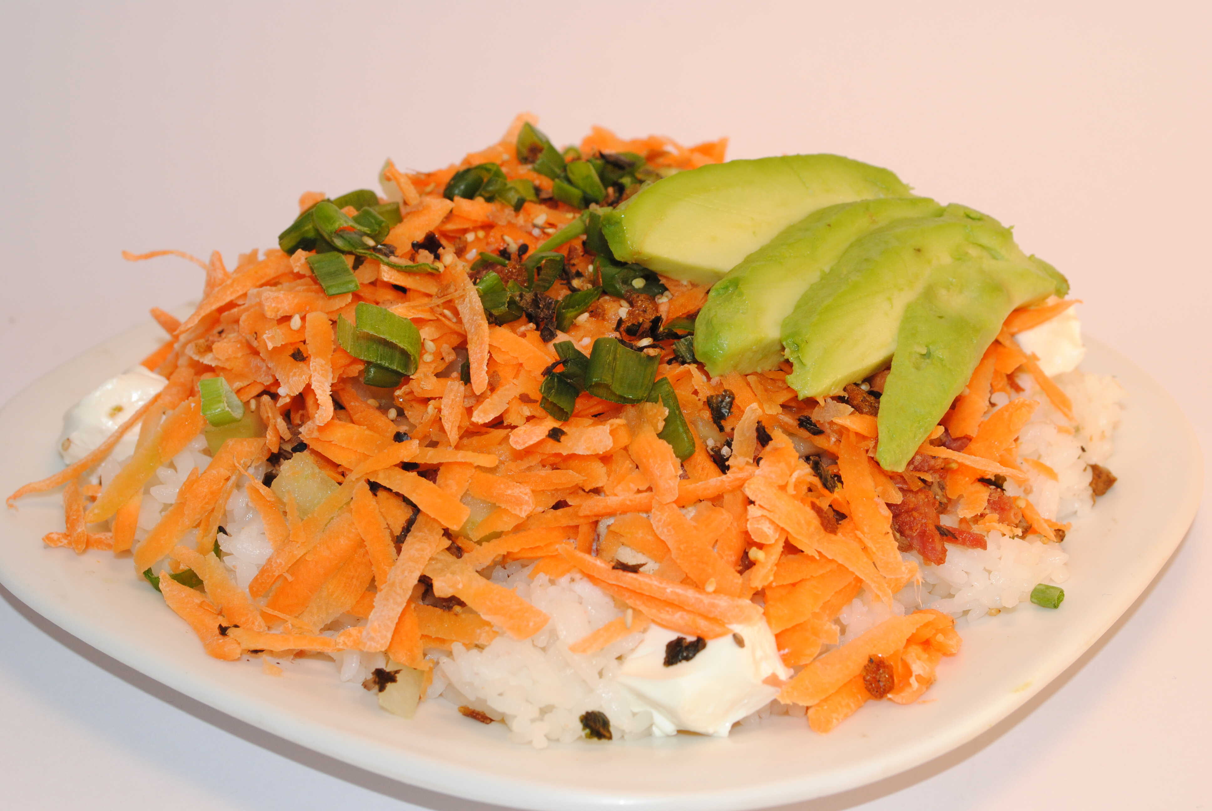 Arroz frito, zanahoria, calabaza, Philadelphia, Tampico, pepino, aguacate, aderezo especial y cebollín.