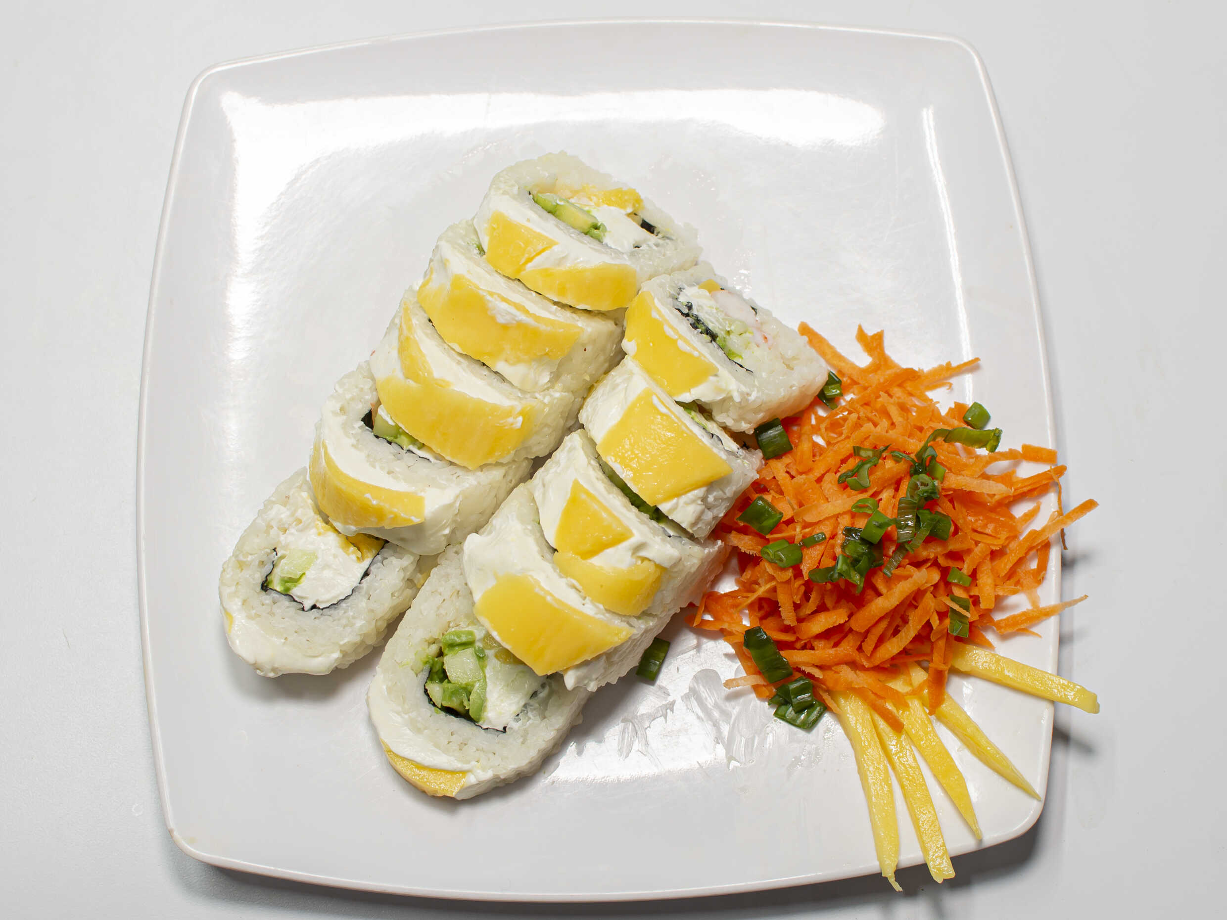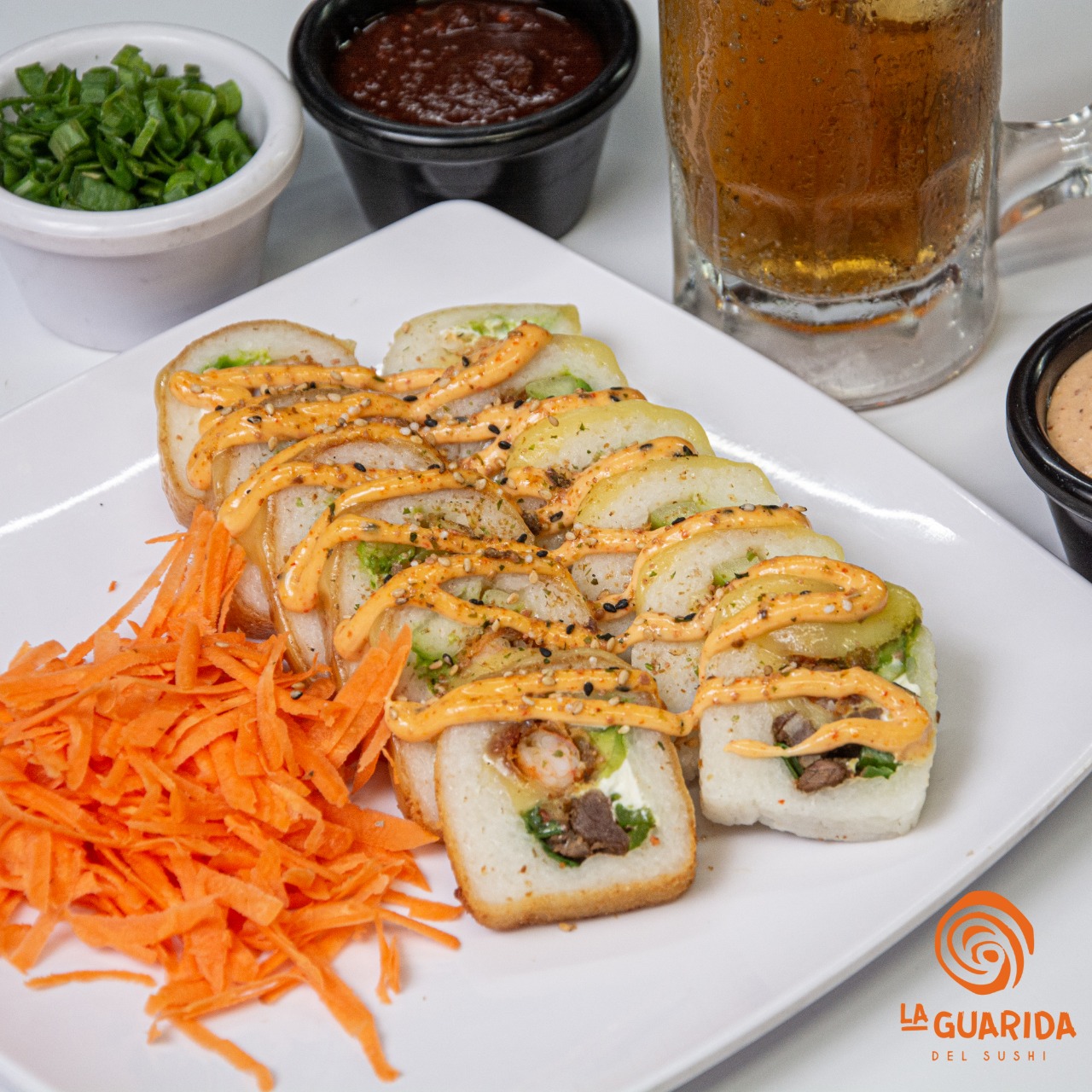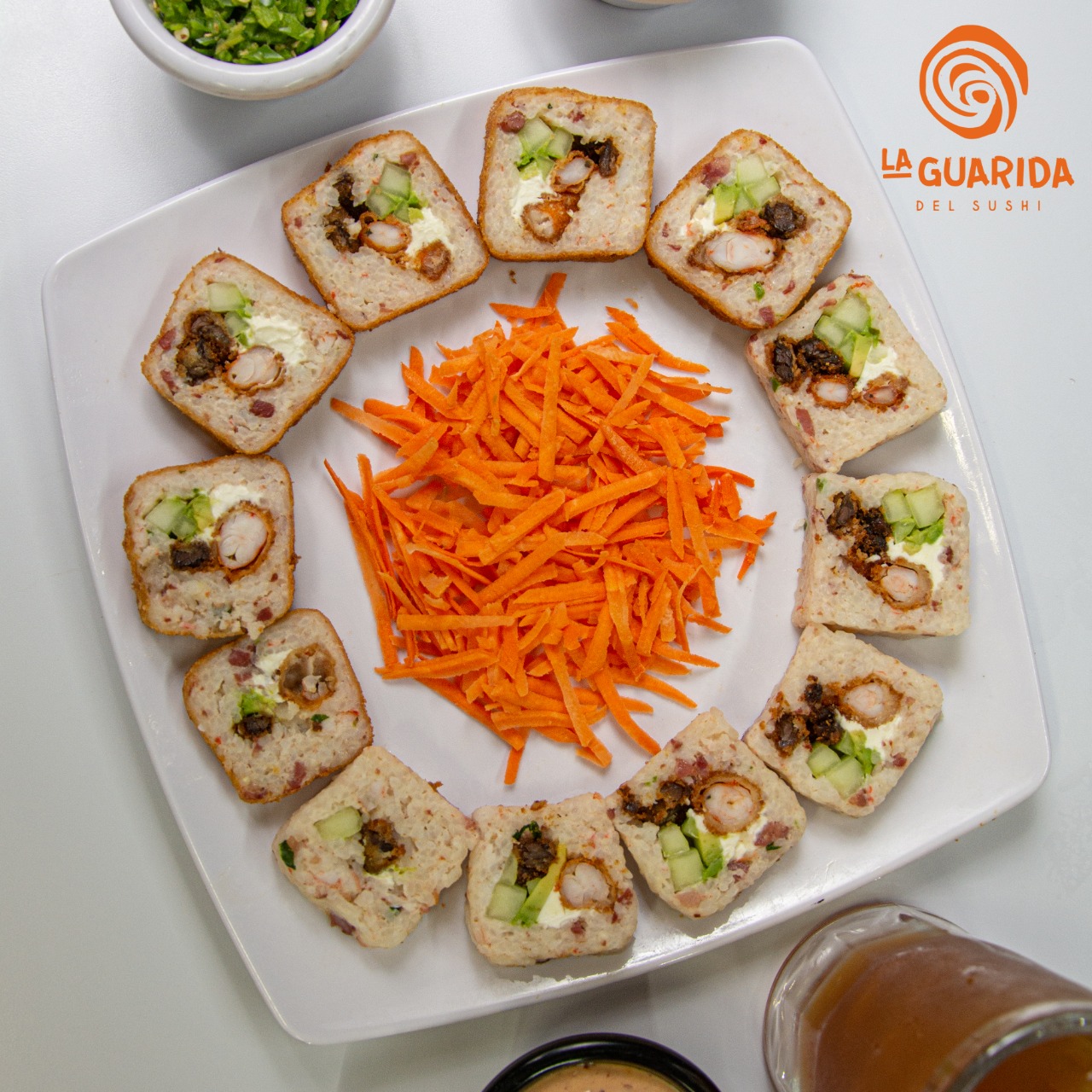 Arroz frito, zanahoria, calabaza, Philadelphia, Tampico, pepino, aguacate, aderezo especial y cebollín.