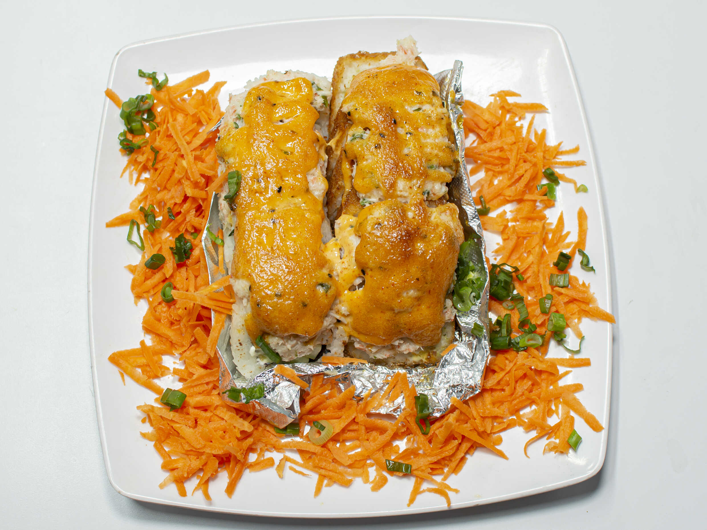 Camarón empanizado, carne, queso y cebollín, gratinado con aderezo especial y furikake.