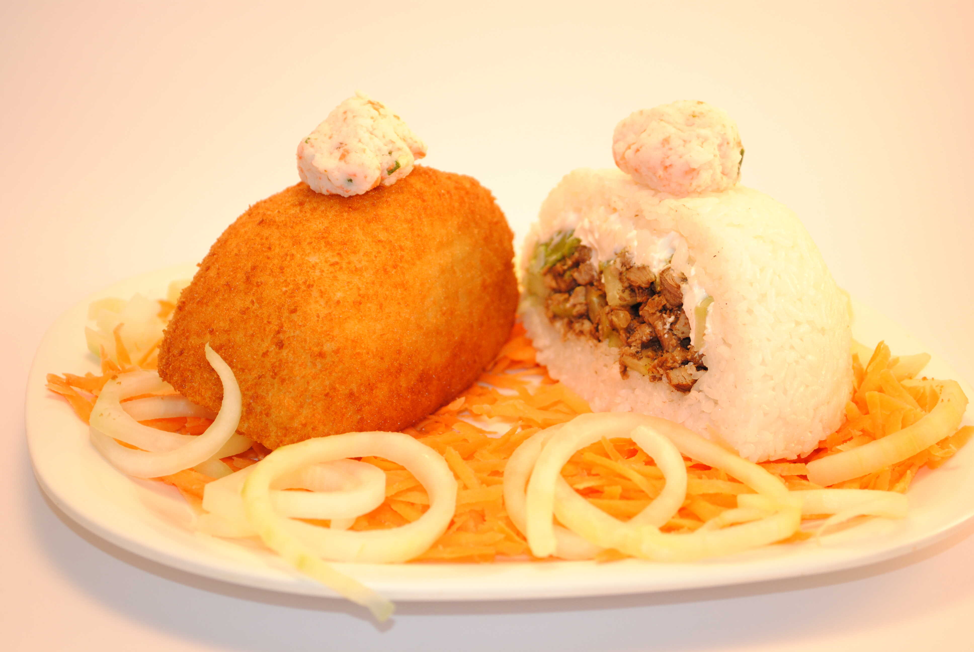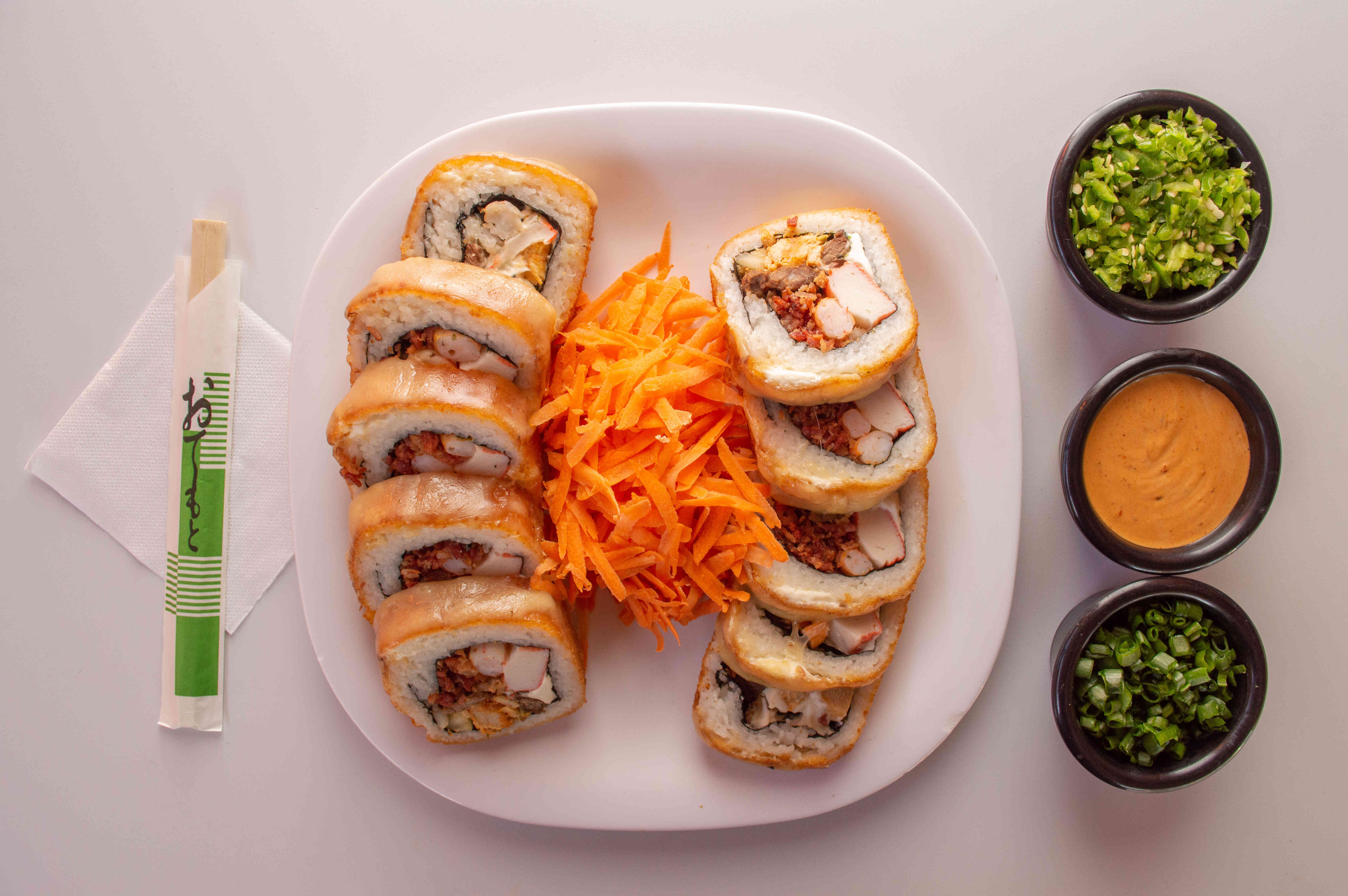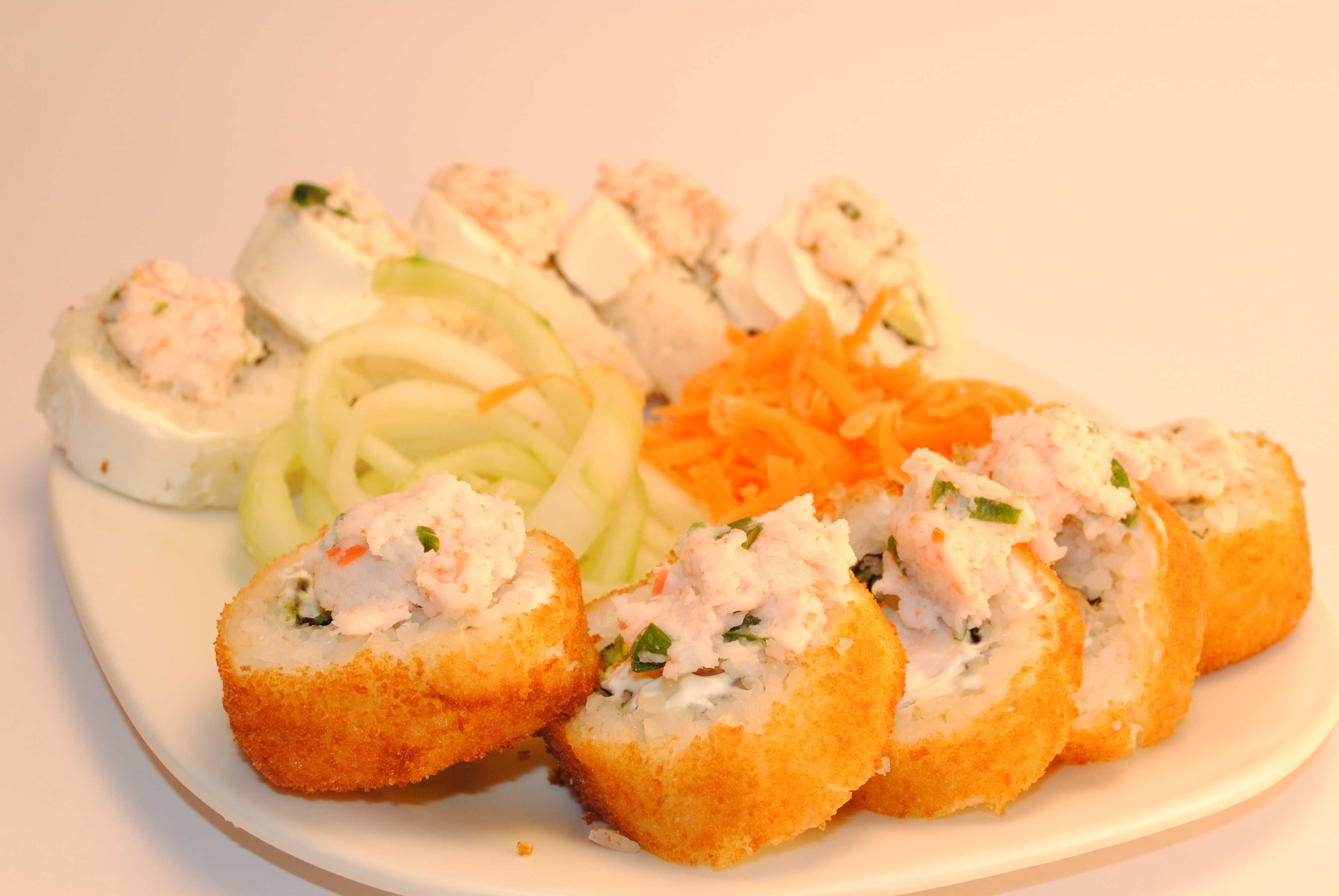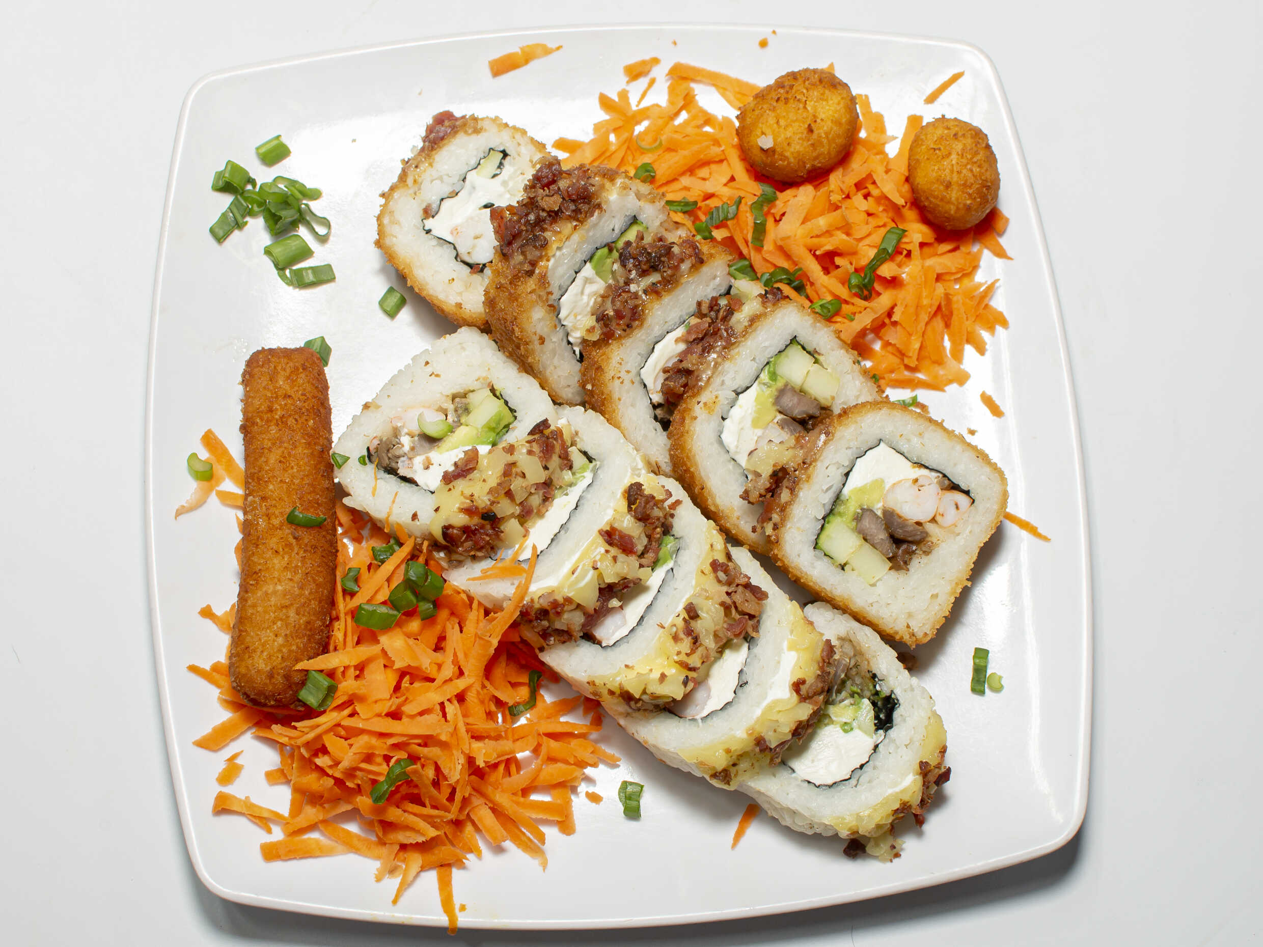 Arroz, empanizado, Philadelphia, pepino, aguacate, zanahoria, aderezo especial, furikake y cebollín.