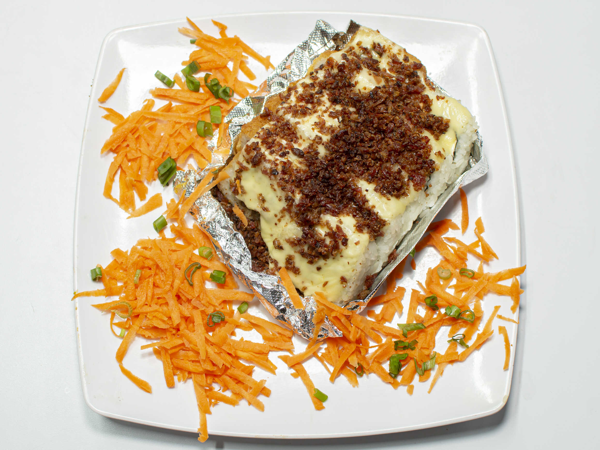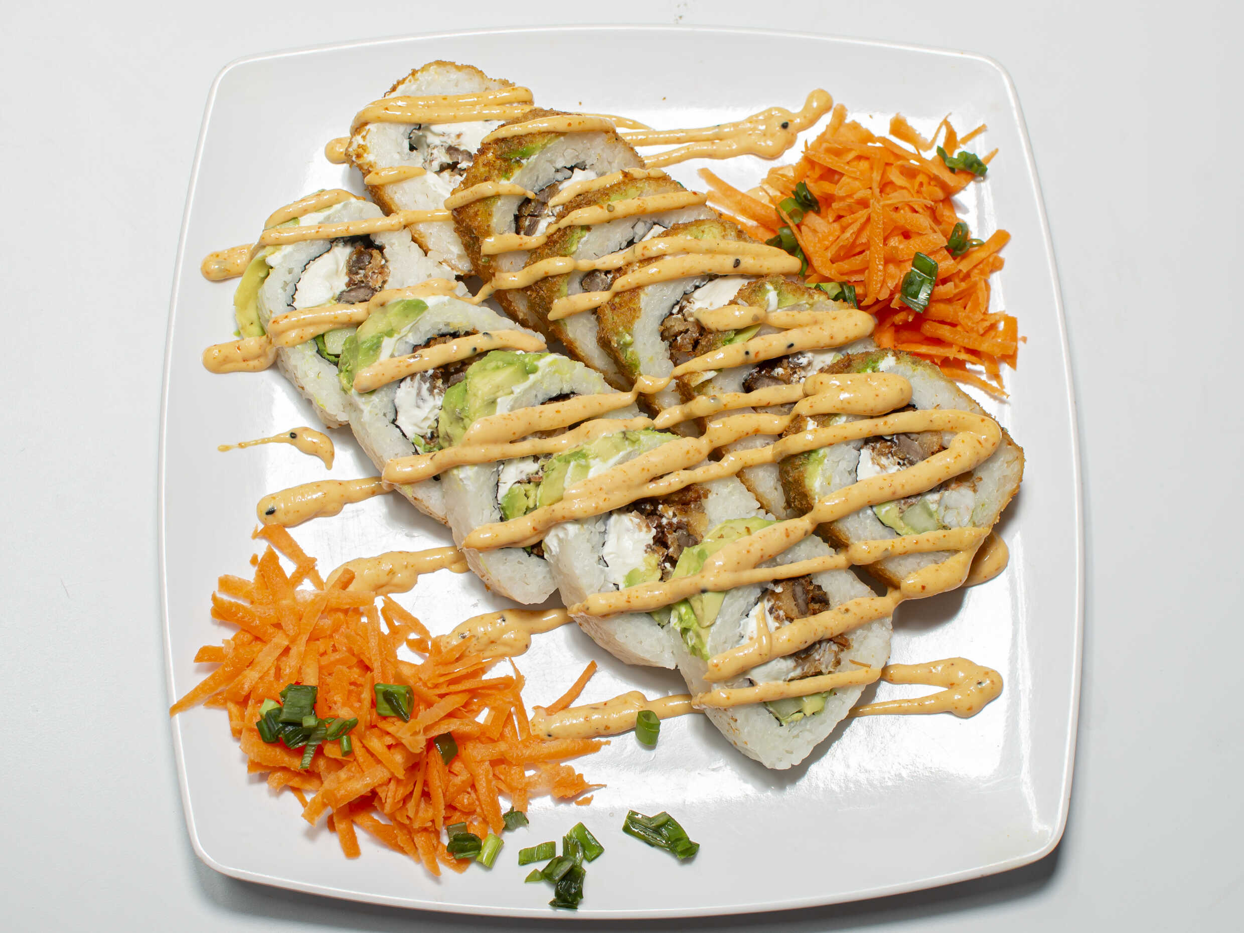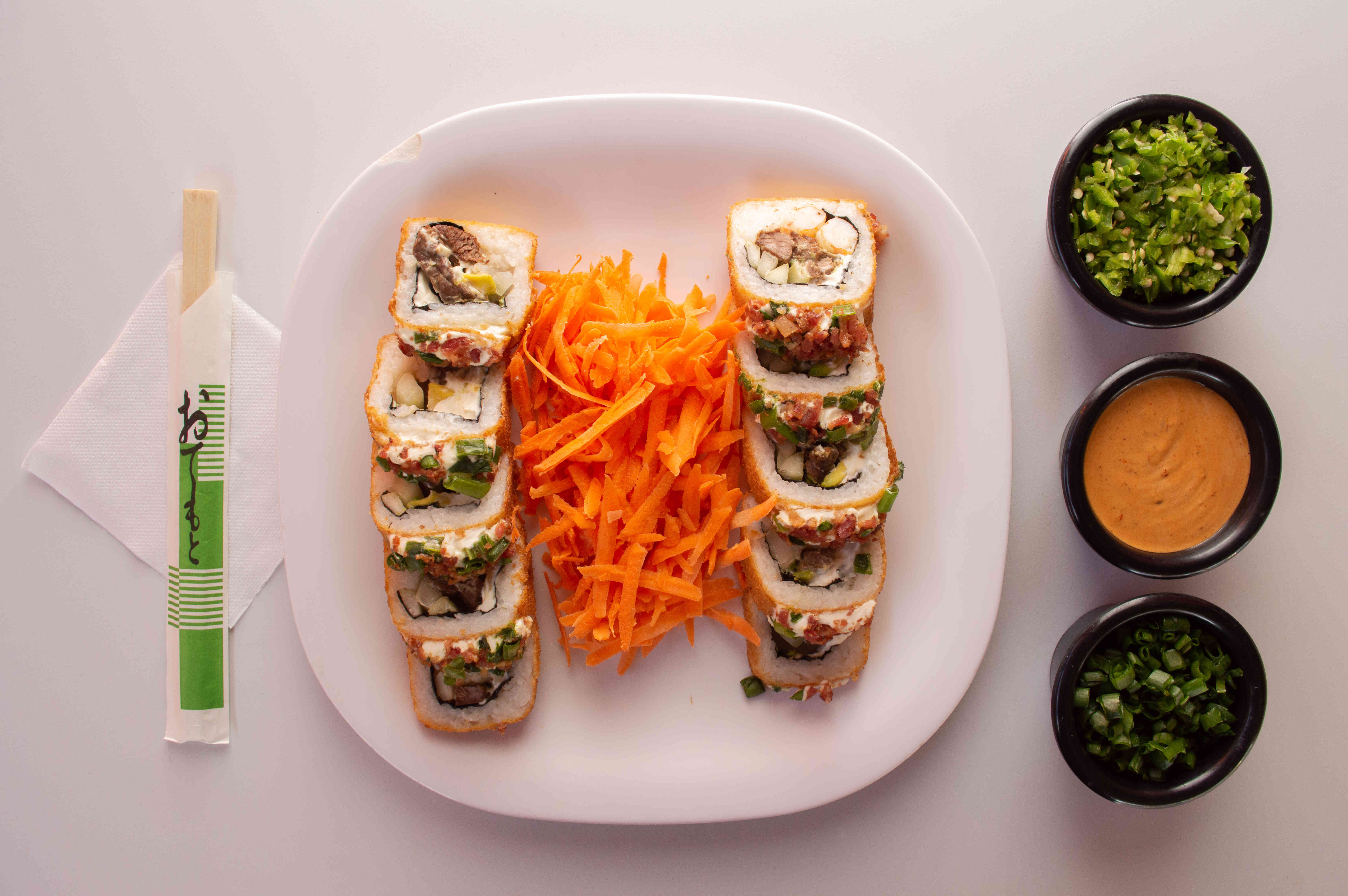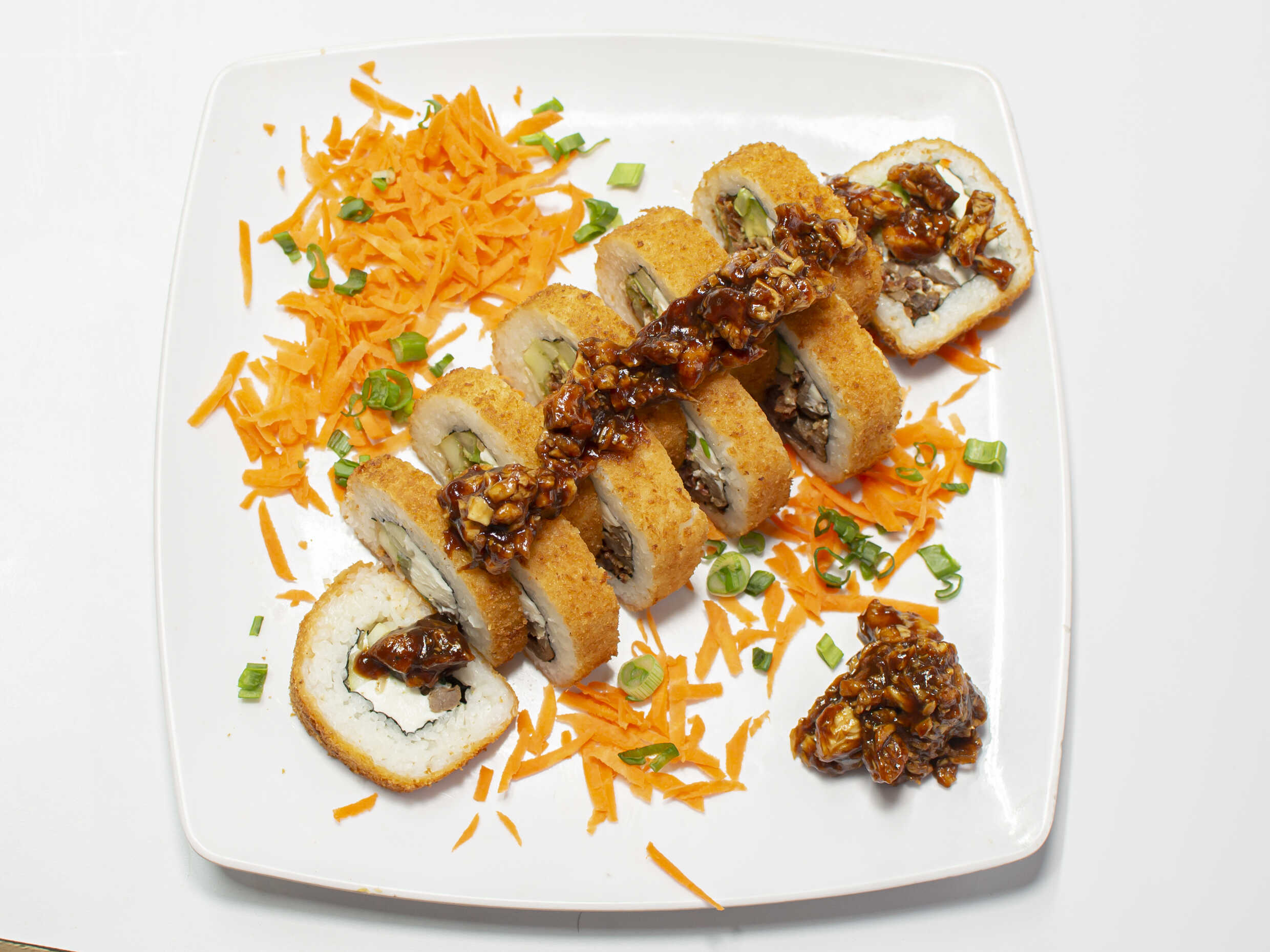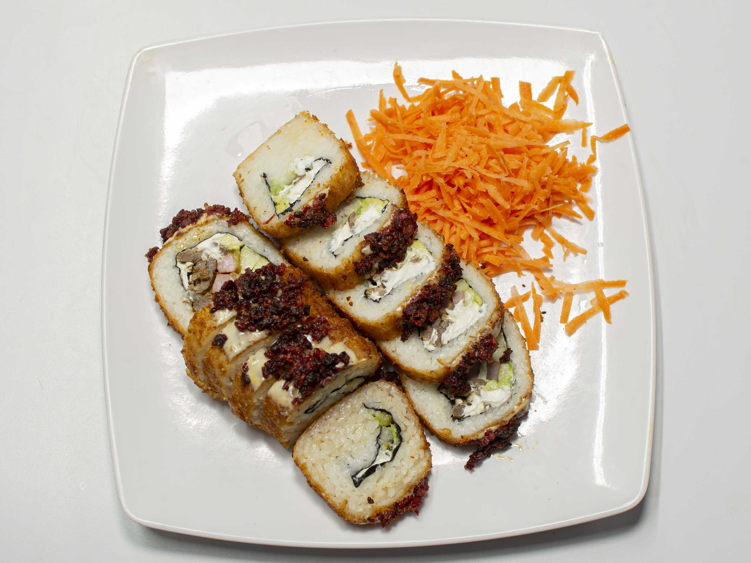 Arroz, empanizado, Philadelphia, pepino, aguacate, zanahoria, aderezo especial, furikake y cebollín.
