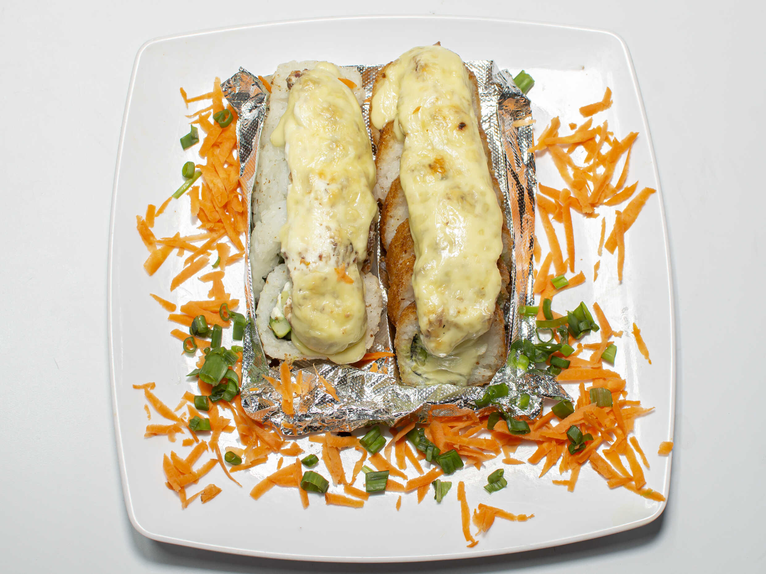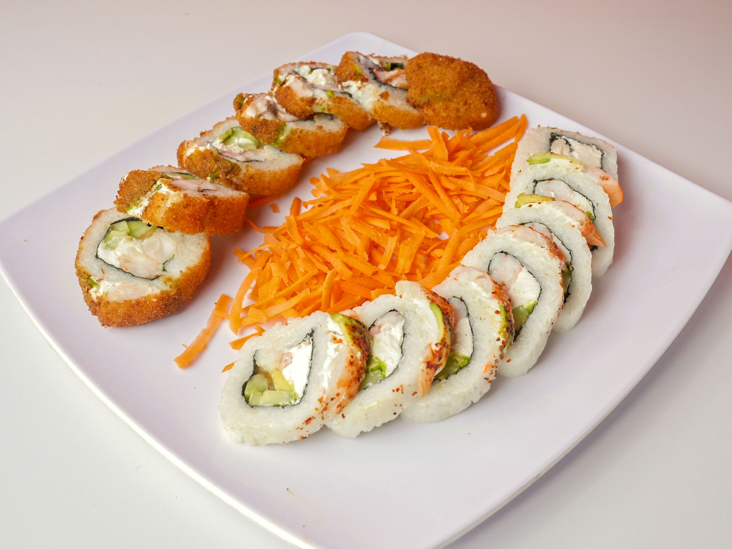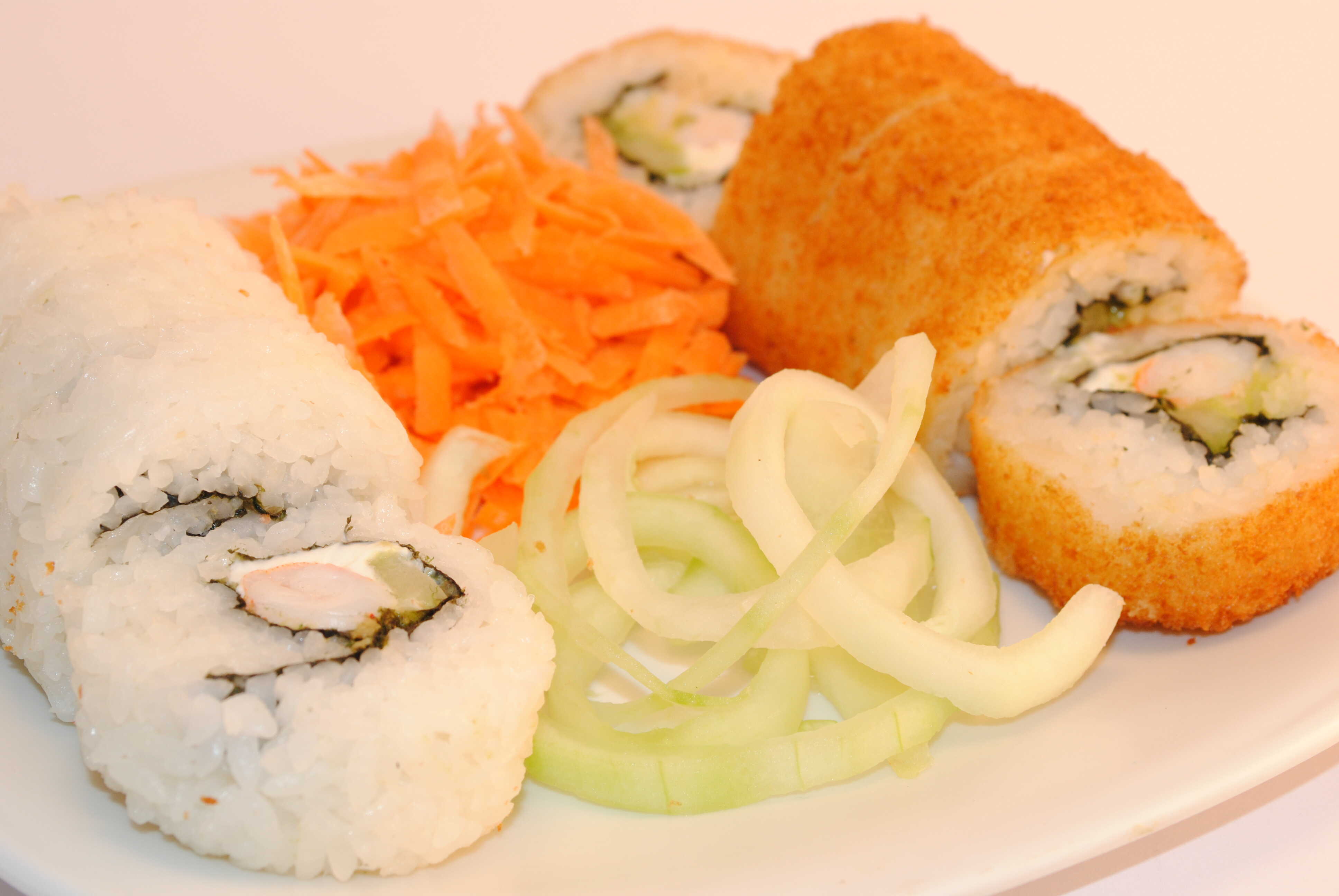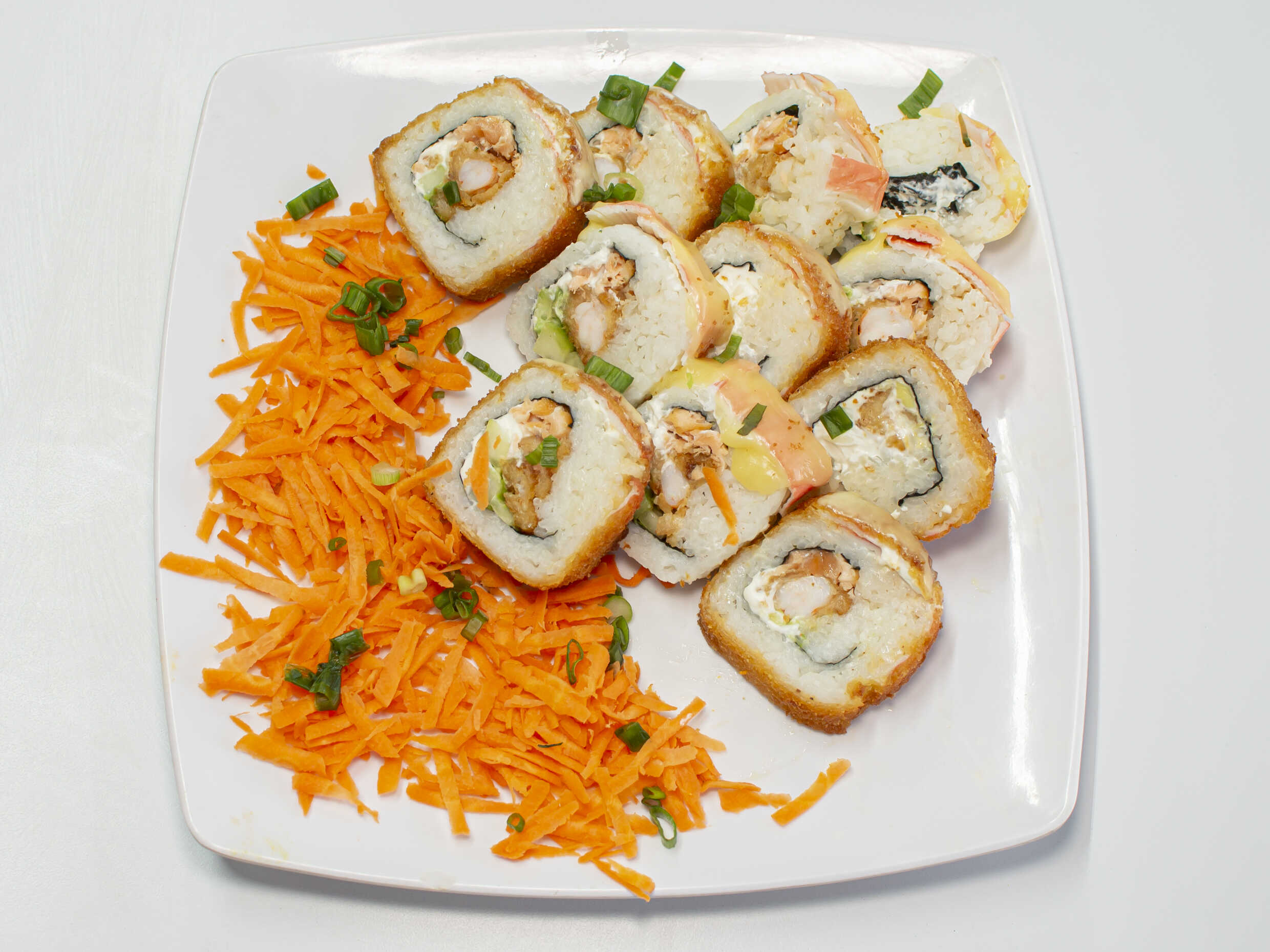 Arroz, empanizado, Philadelphia, pepino, aguacate, zanahoria, aderezo especial, furikake y cebollín.