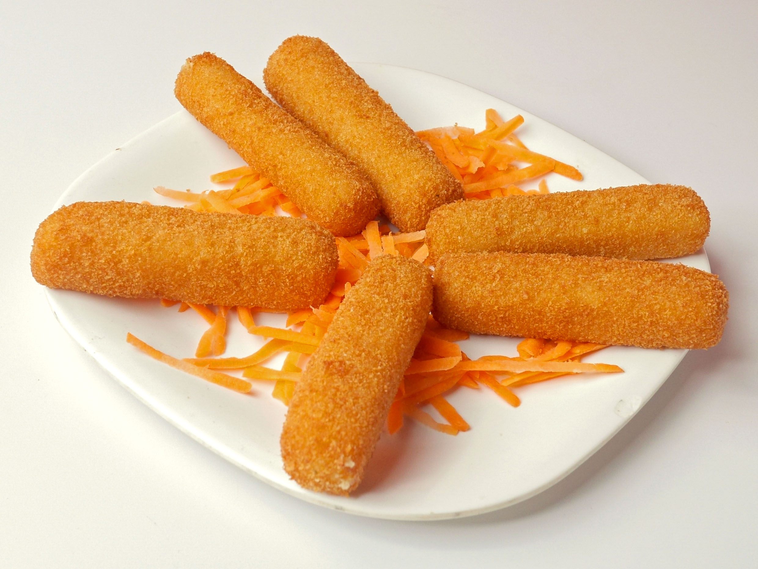 6 tiras de queso gouda empanizadas.