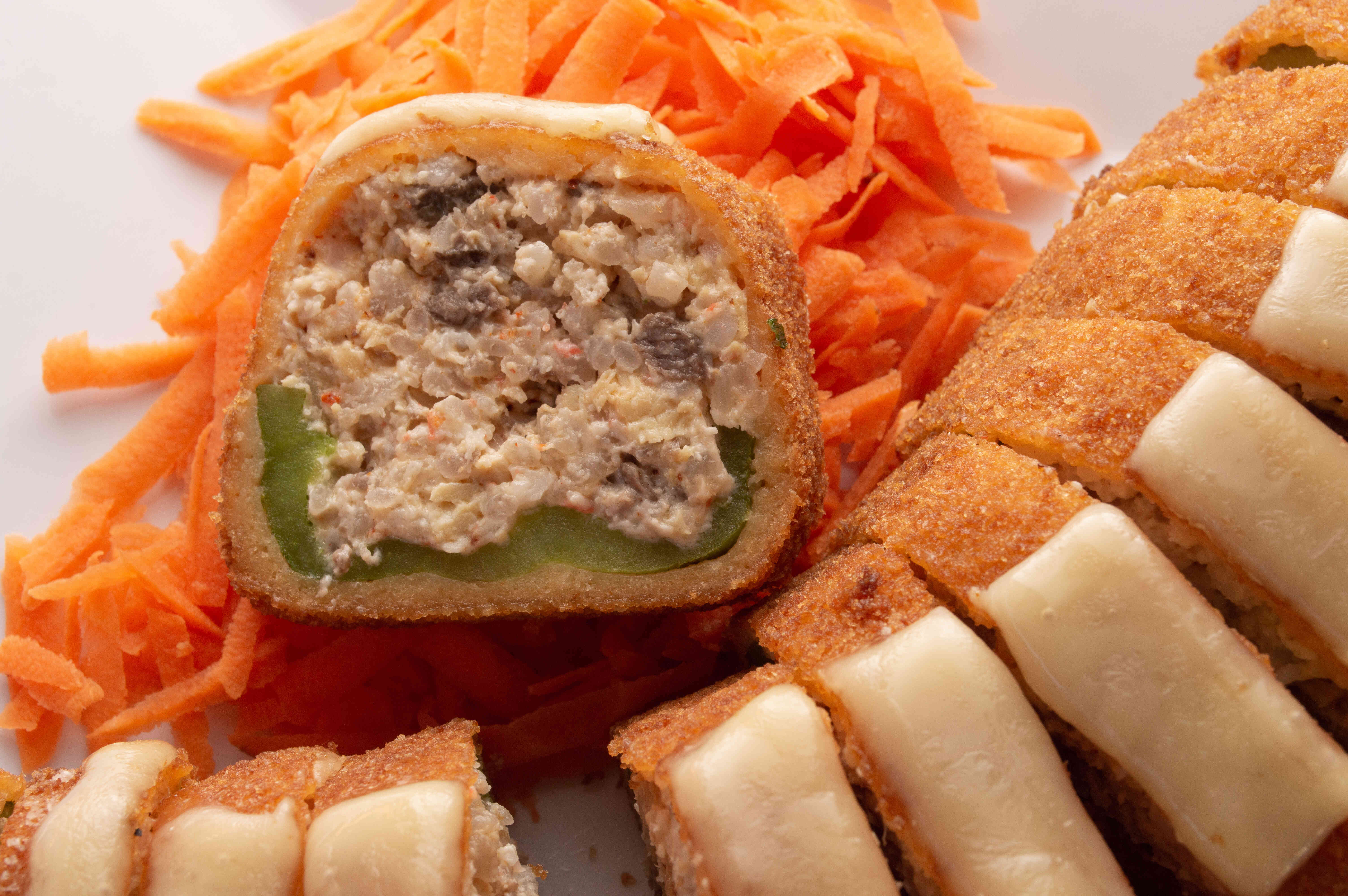 Chile verde relleno de una mezcla de arroz, Philadelphia, Tampico, pollo, carne, camarón, Tajín, empanizado y con queso gratinado encima.