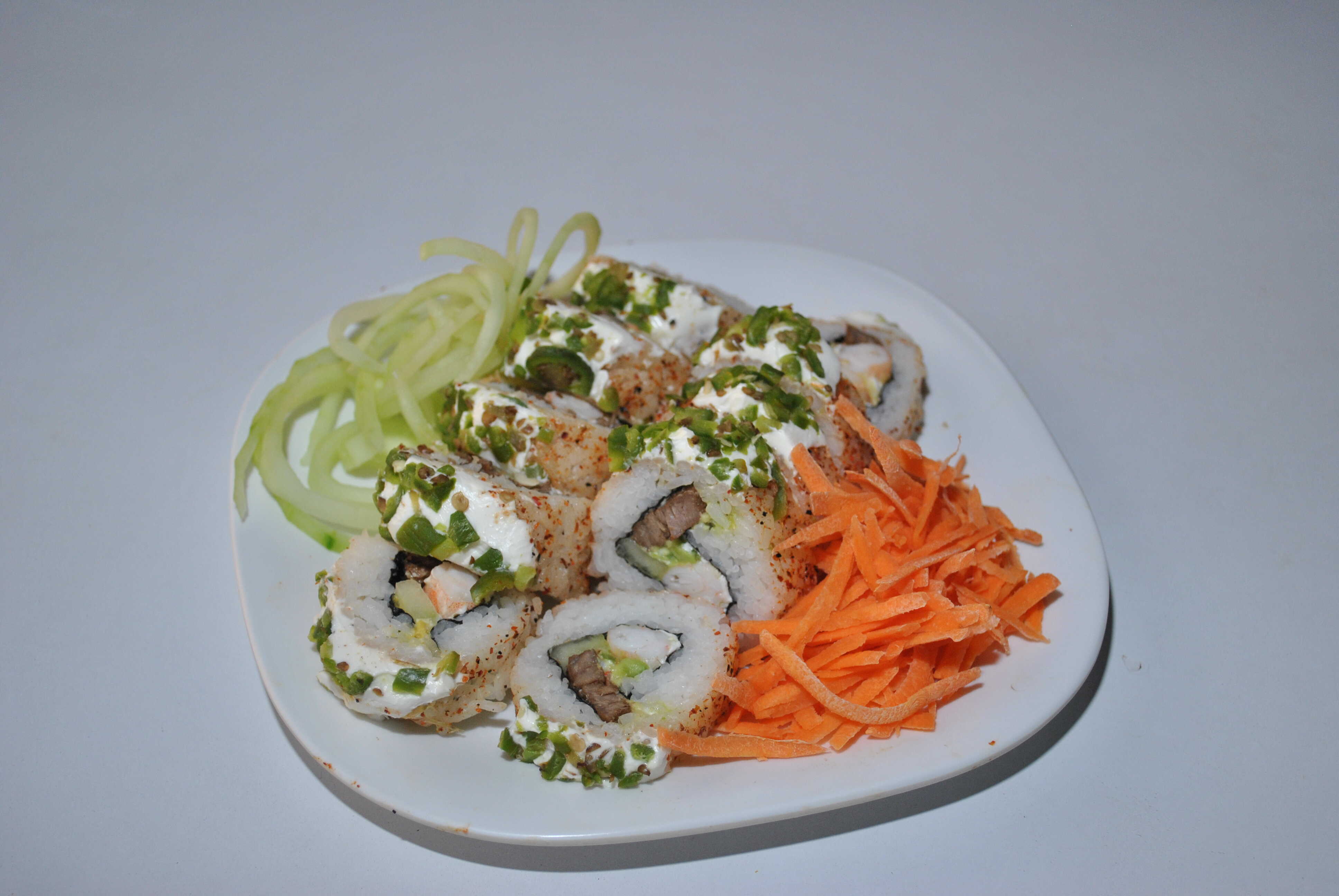 Carne, pollo, chile verde, queso gouda y por fuera phila y zanahoria.
