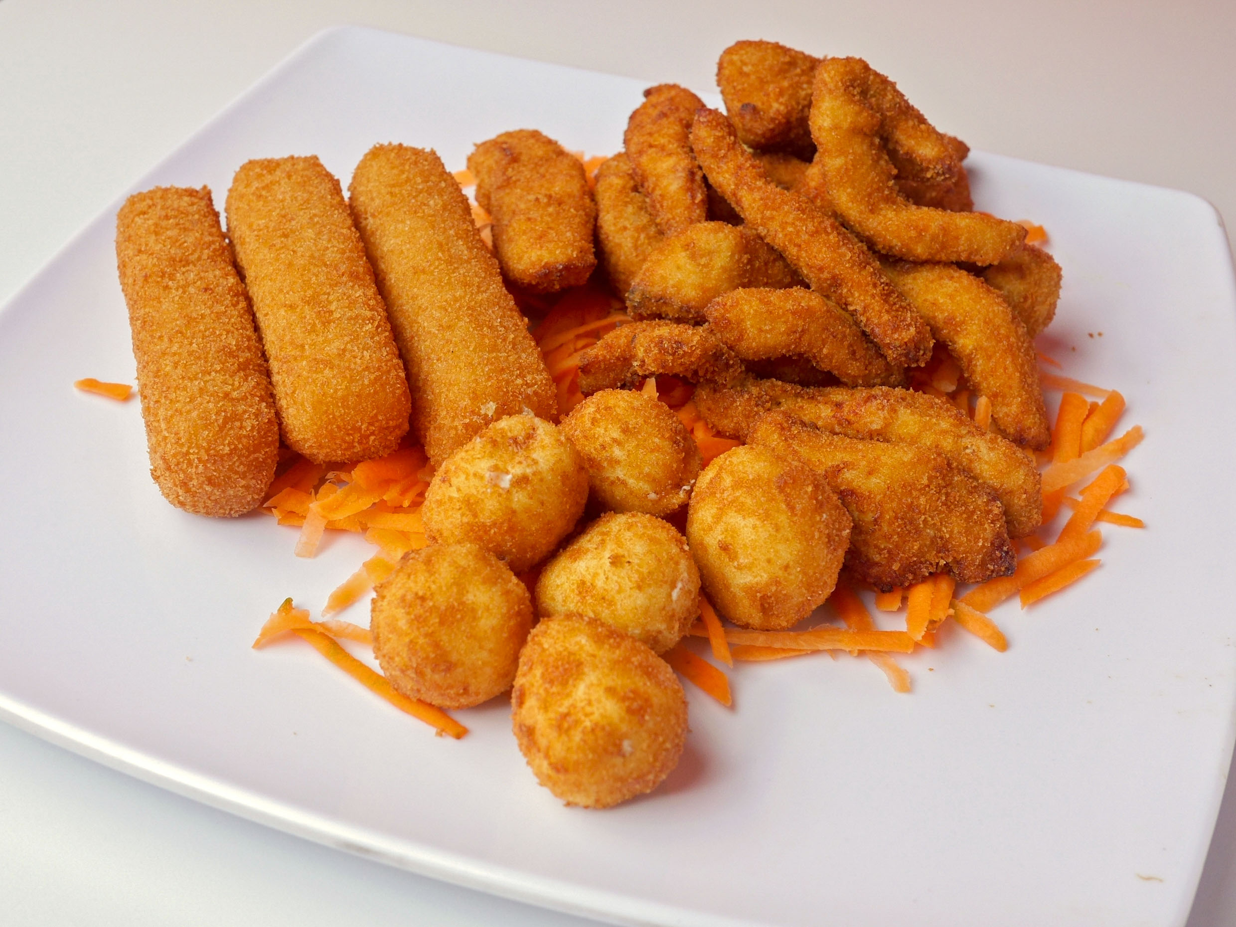 6 cubitos, 3 dedos de queso y pollo empanizado.