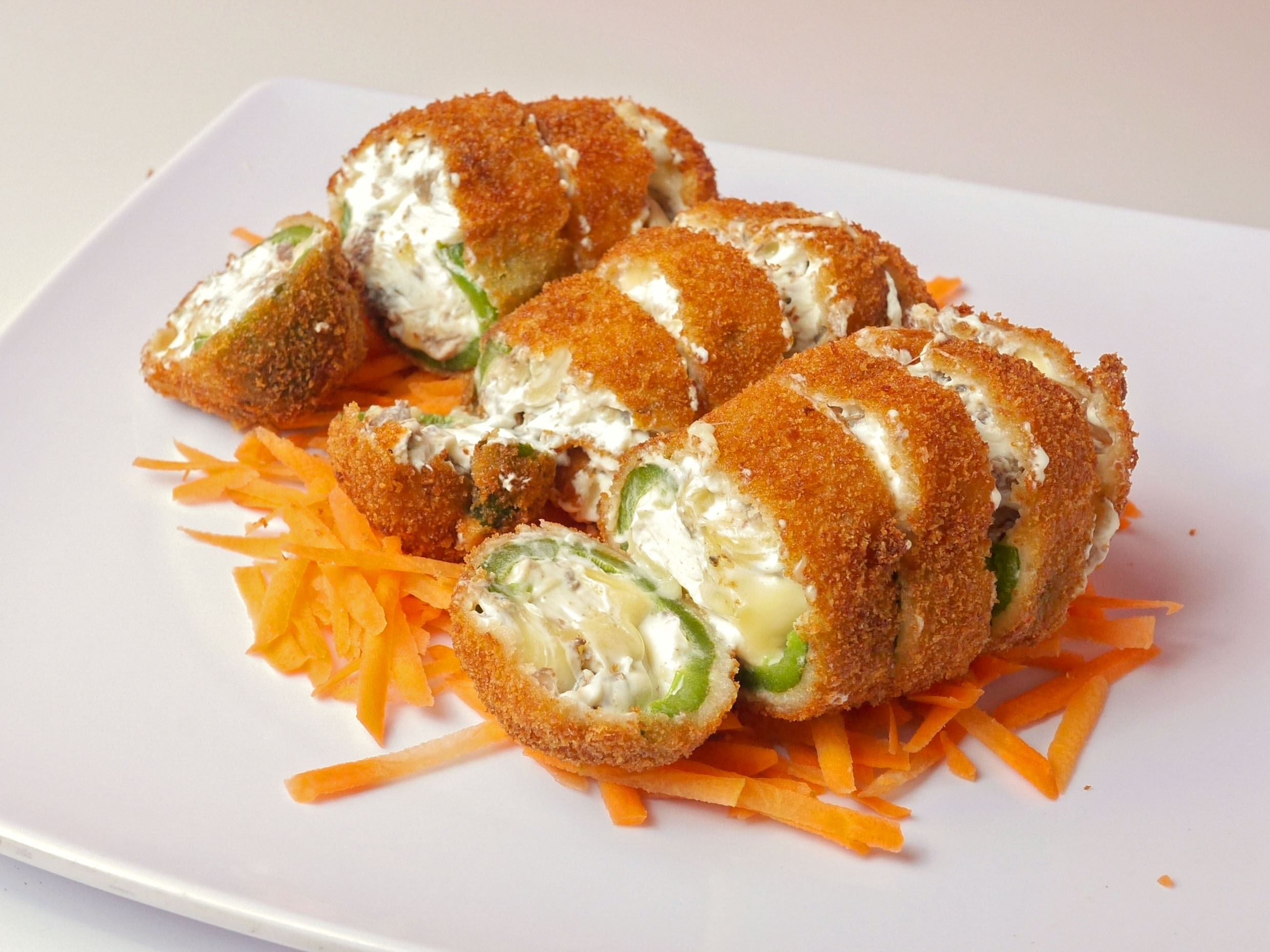 3 jalapeños rellenos de Philadelphia, carne, gouda, y empanizados.