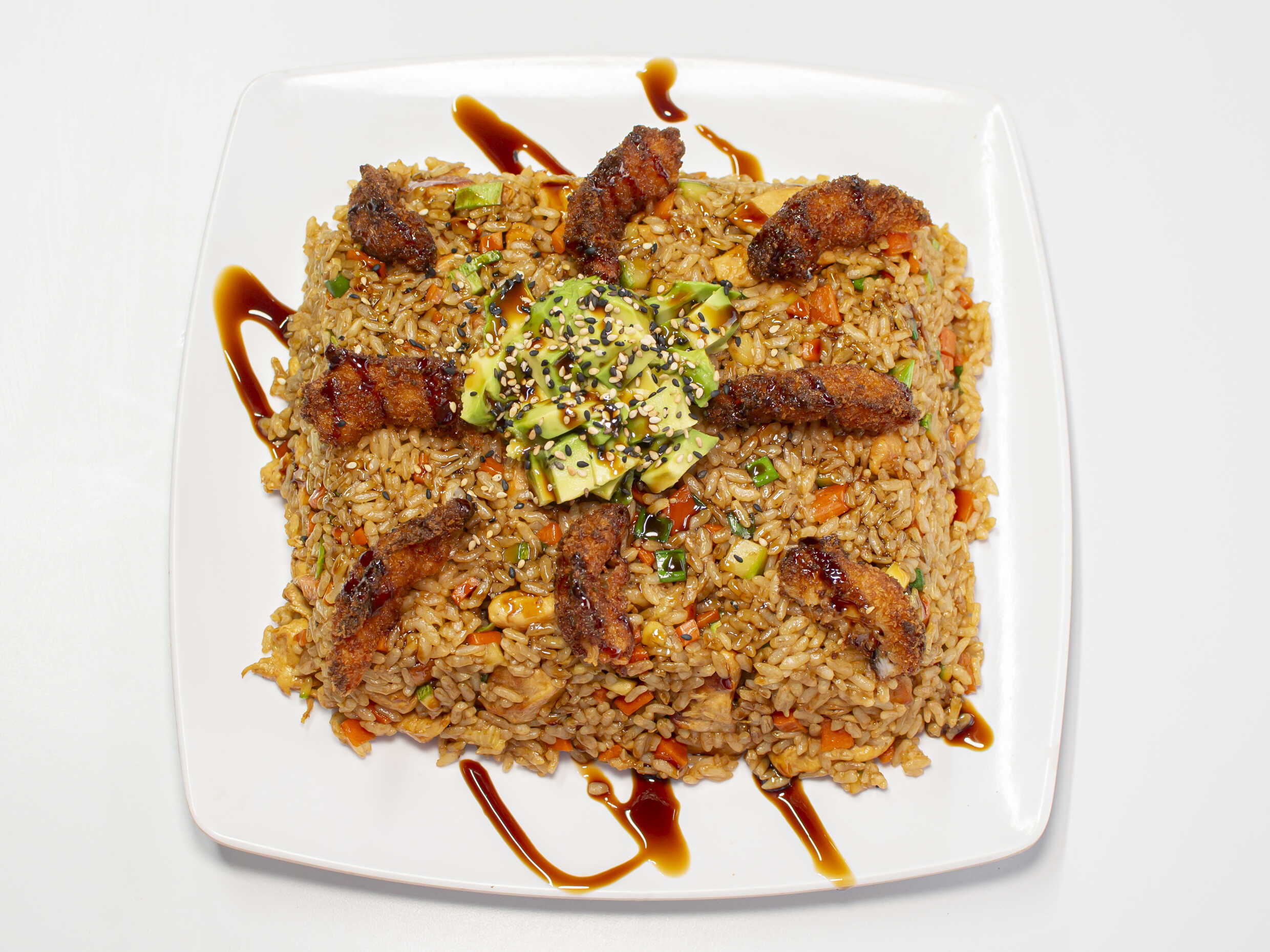 Arroz frito con pollo y verduras acompañados de camarones empanizados y aguacate.
