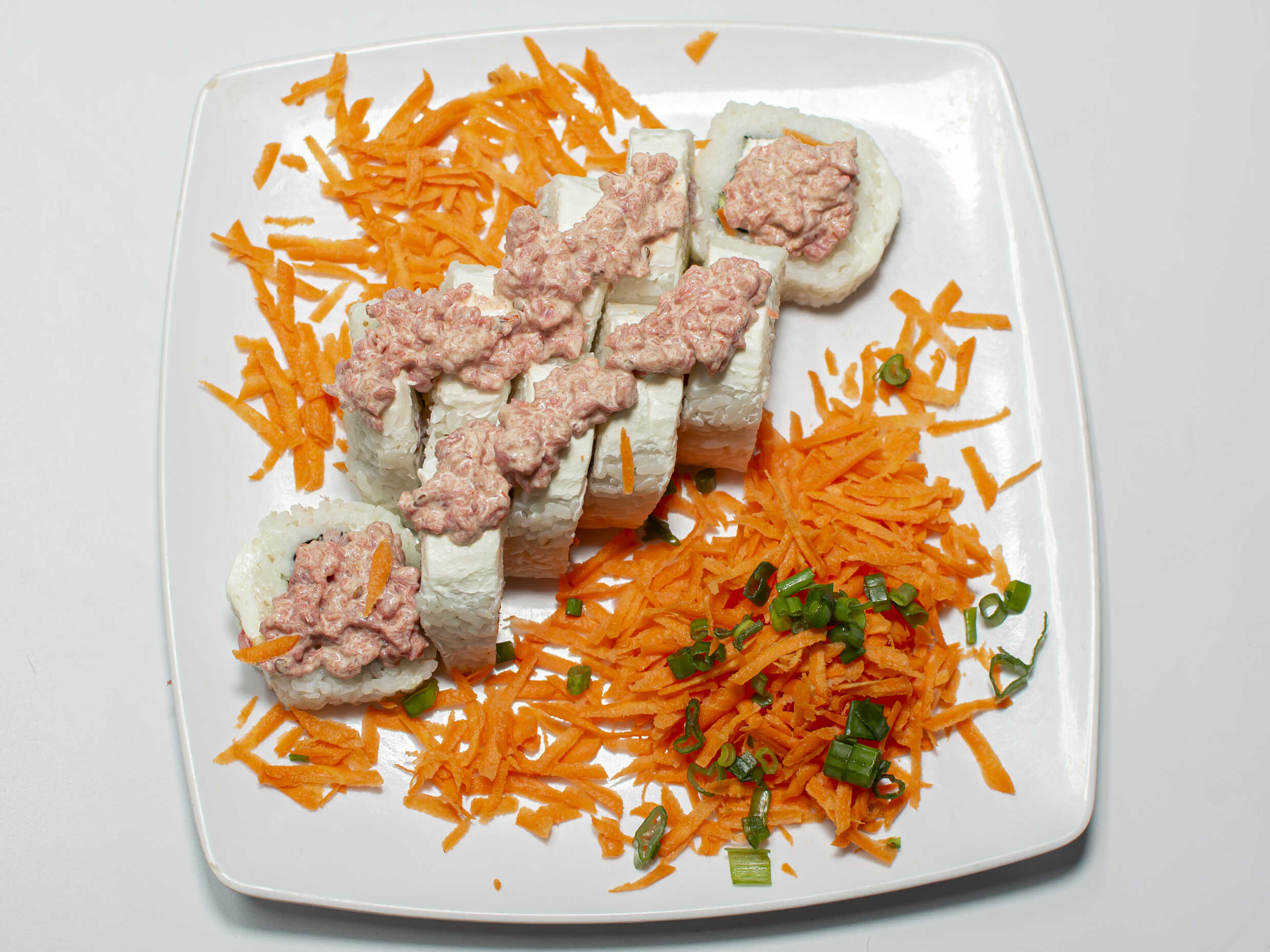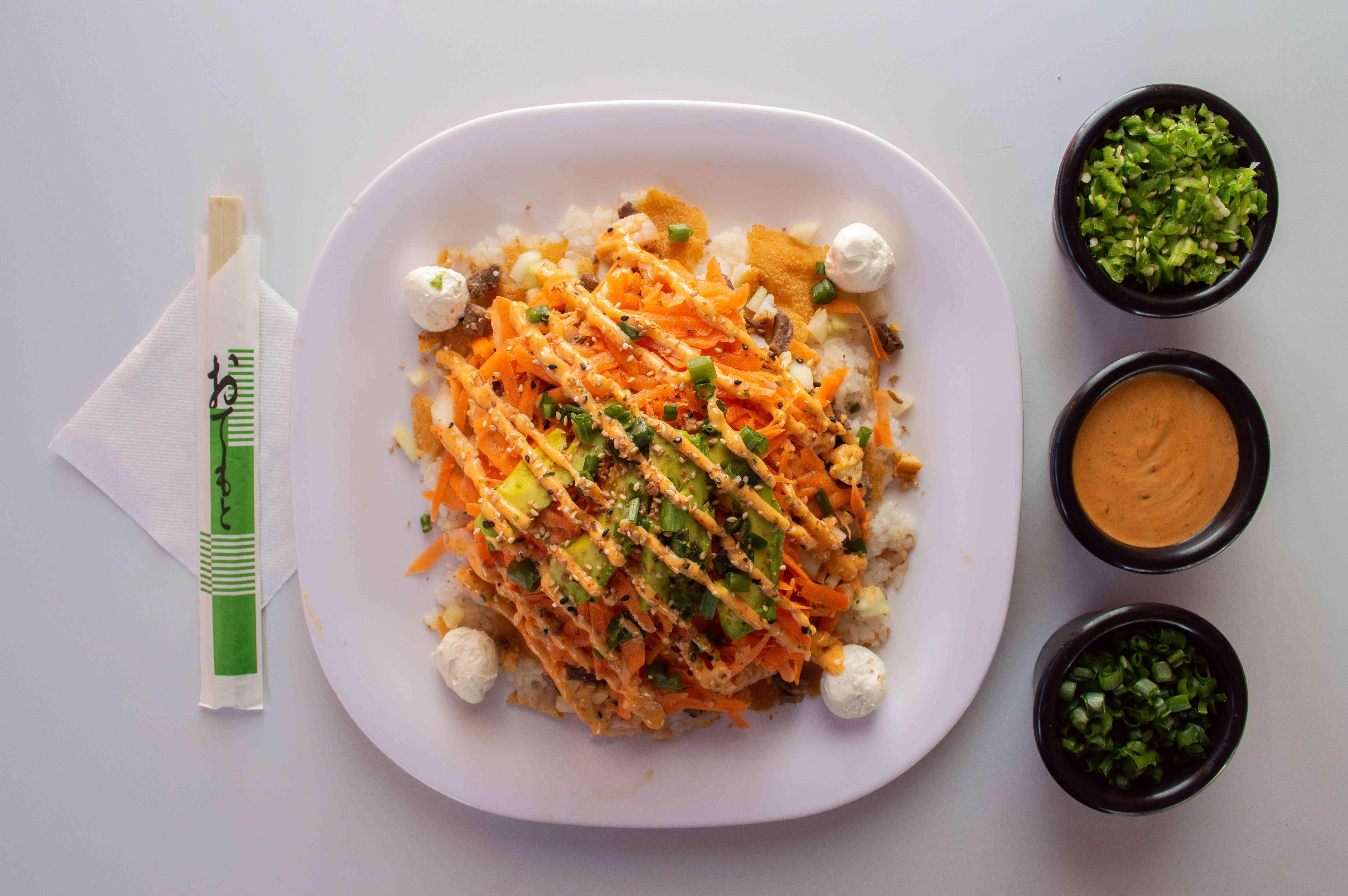 Cama de arroz, Tampico, verdura, Philadelphia, 1 ingrediente al busto, furikake y cebollín.