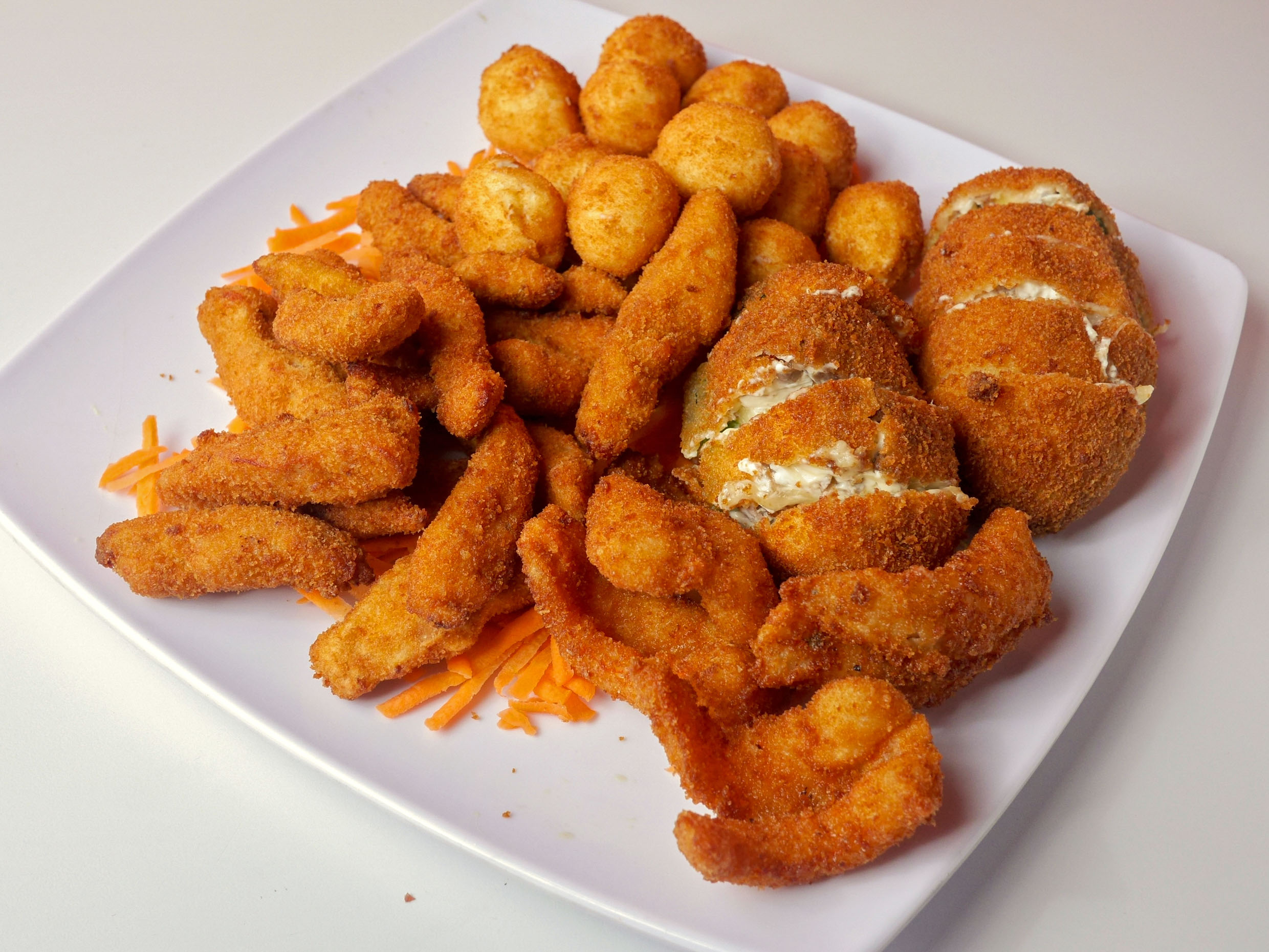4 camarones en mariposa empanizados, pollo empanizado, unos cubitos y 2 chiles especiales.