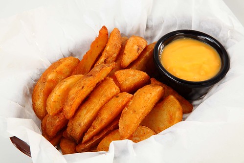 Papas en gajo, acompañadas de queso amarillo preparado en casa.