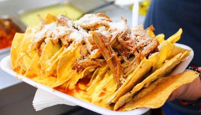 Ingredientes: totopos, frijol, queso amarillo, queso rallado, jalapeño y carne.
