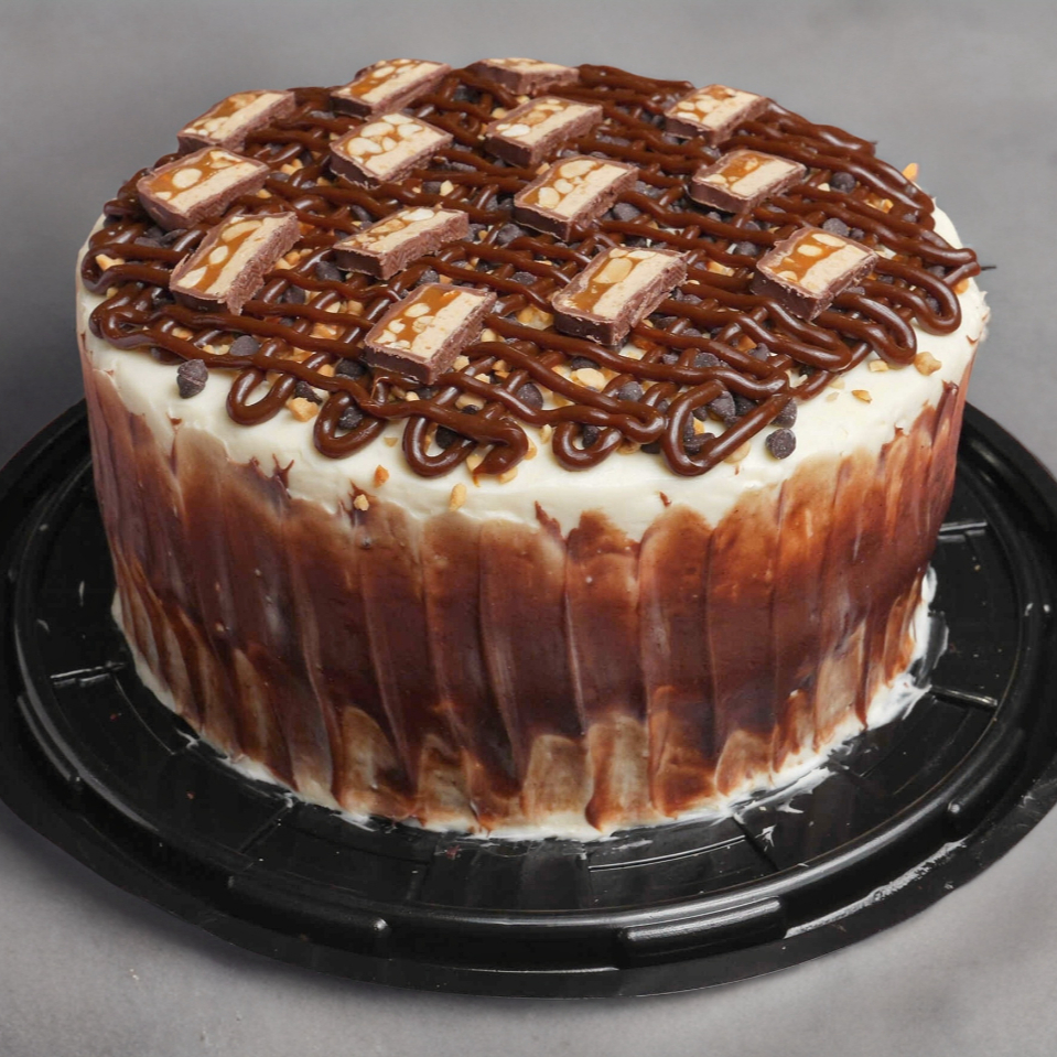 Pastel con pan de chocolate y vainilla relleno de crema con snickers cubierto en nuestra crema casera de queso crema.