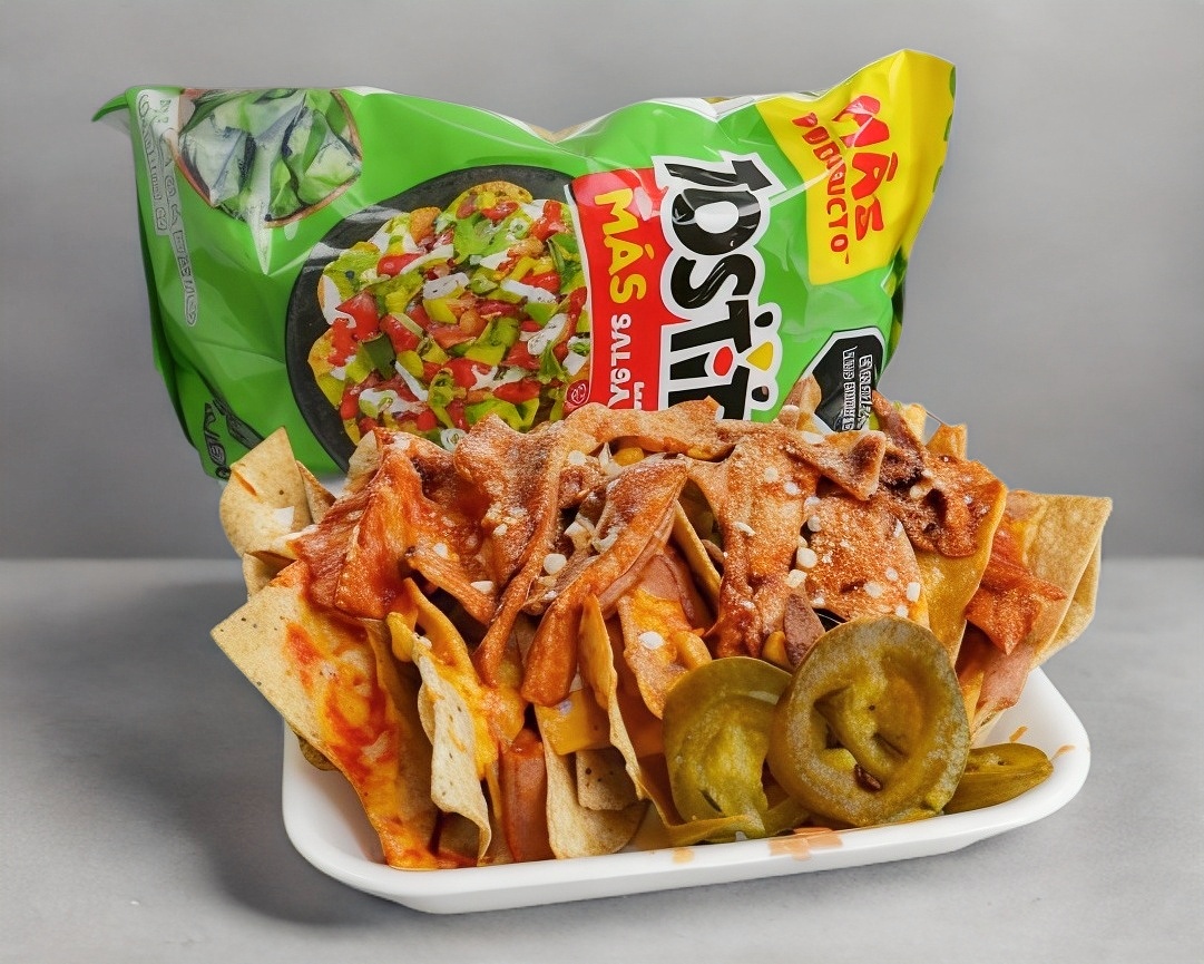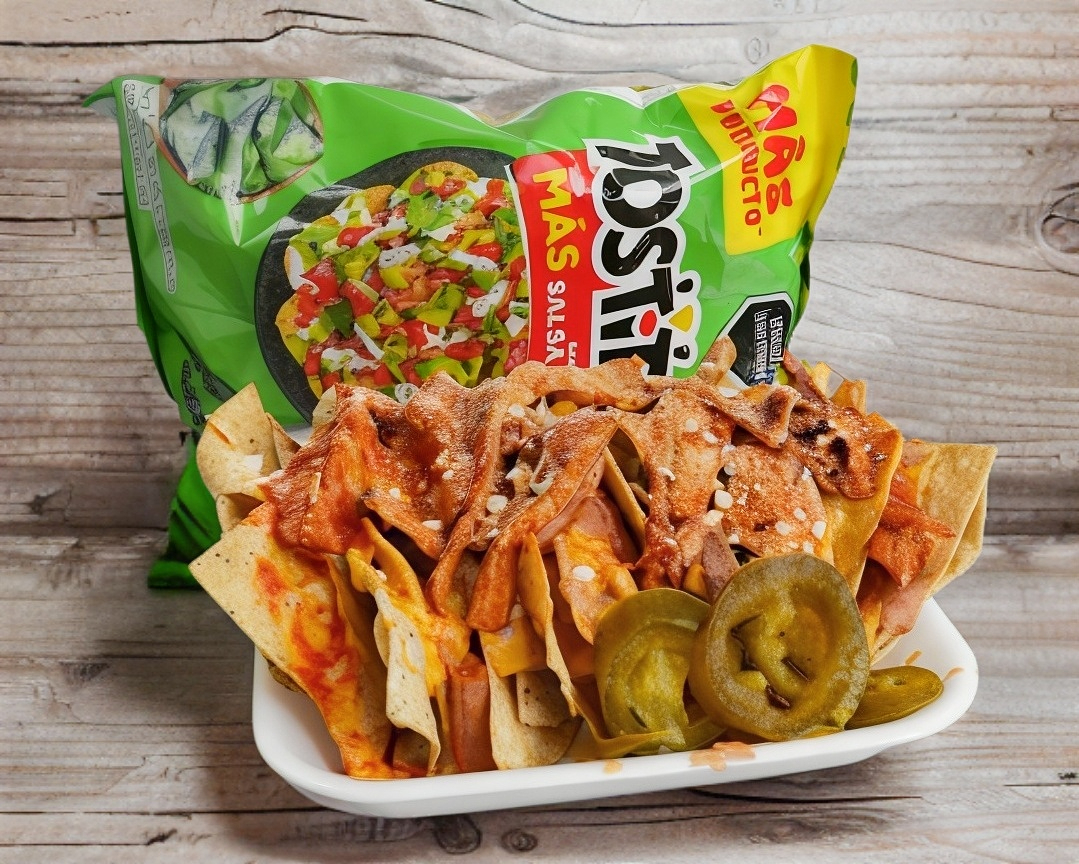 Ingredientes: Tostitos, frijol, queso amarillo, queso rallado y chiles jalapeños.
