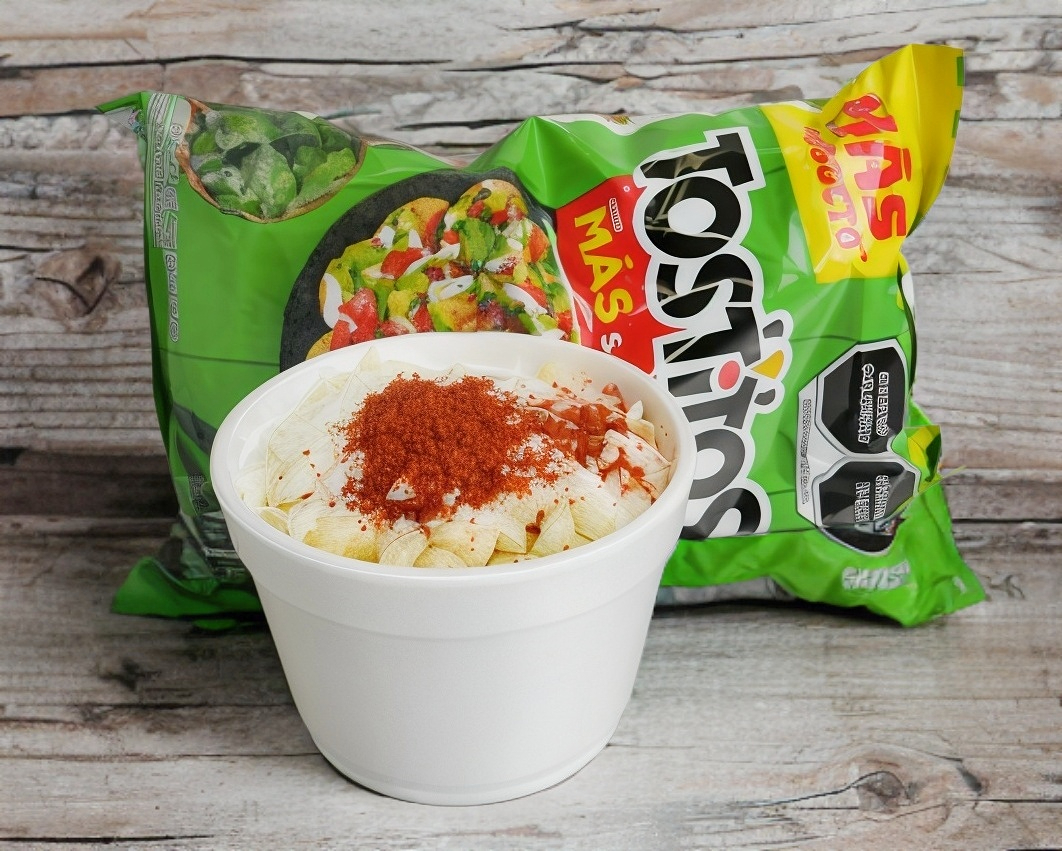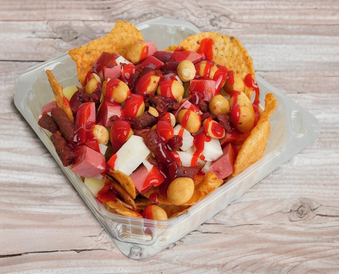 Ingredientes: Tostitos, cacahuate, rielito, pepino, jícama, salchicha y Clamato.