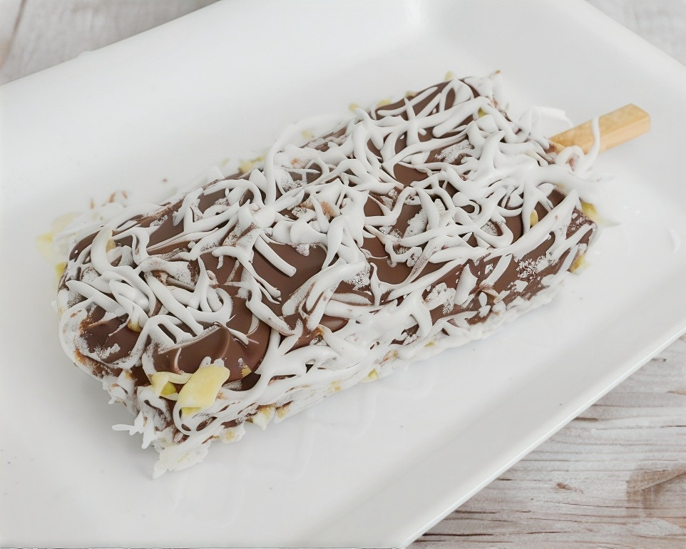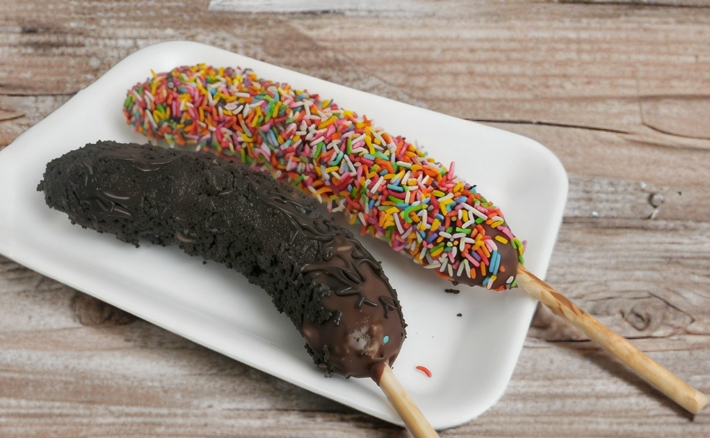 Plátano congelado cubierto de chocolate y chispas de colores.