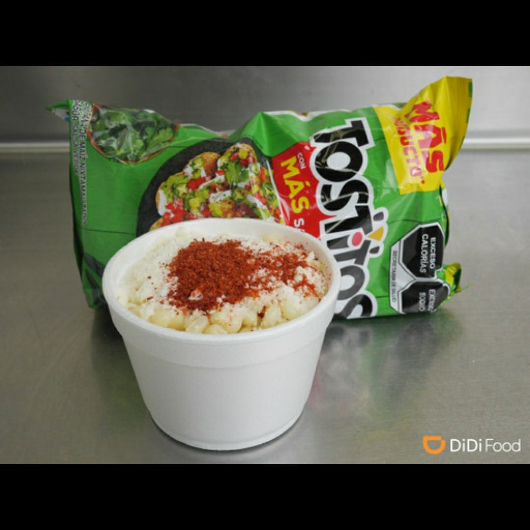 Ingredientes: Tostitos, elote, mantequilla, crema y queso rallado.