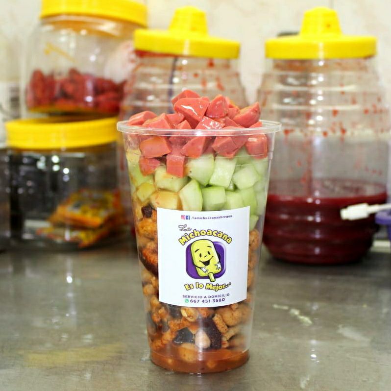 Sabritas de su elección, pepino, jícama, cacahuate, realito, salchicha, serpentina, gomitas, chamoy especial y Clamato.