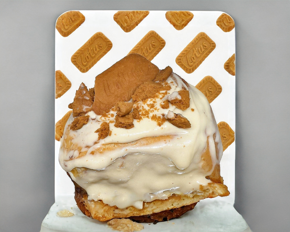 rol de canela con glaseado con galleta lotus espolvoreada y una galleta completa