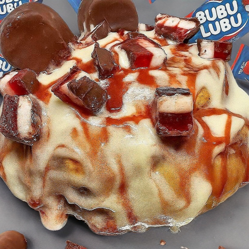 rol de canela glaseado con sabor a fresa y trozos de bubulubu