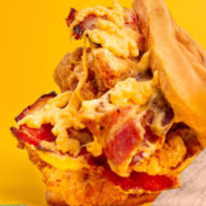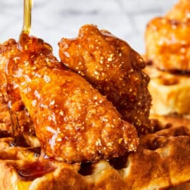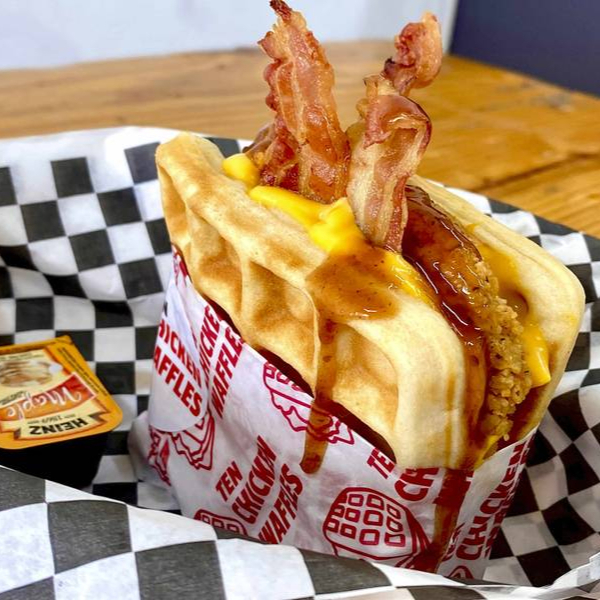 Sandwich de Waffle con chicken tender y queso cheddar americano liquido y tocino