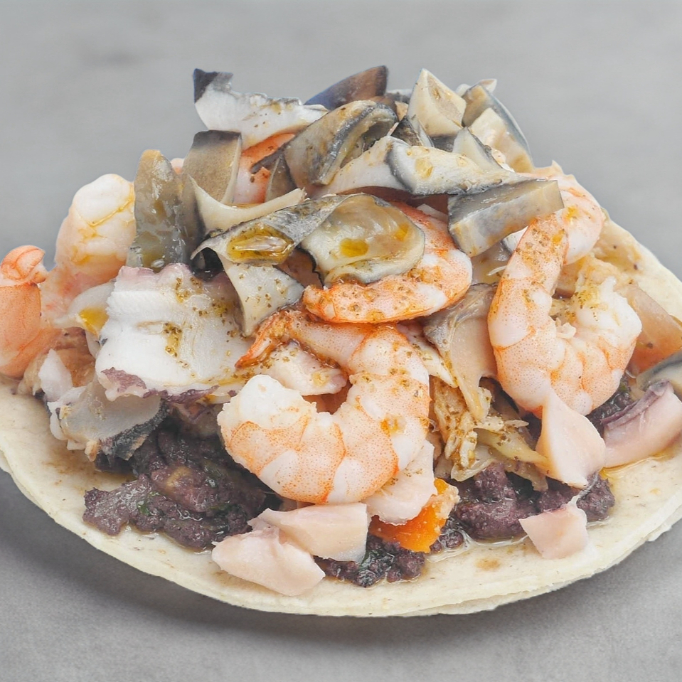 Camarón cocido, camarón crudo, pulpo y callo de lobina, salsado o natural.