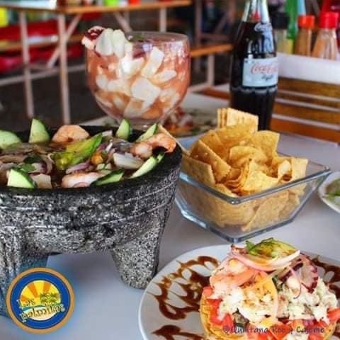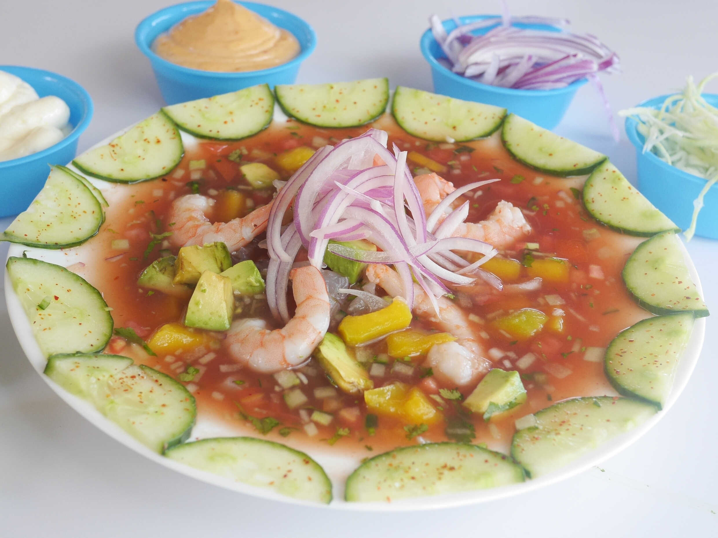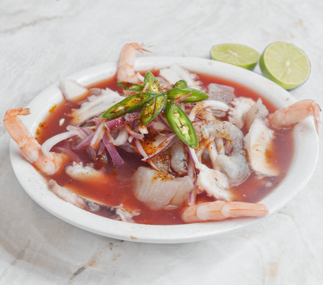 1 Lt Pescado fresco, camarón cocido, pepino, aguacate, mango, tomate, cebolla, cilantro,clamato y jugo de camarón.