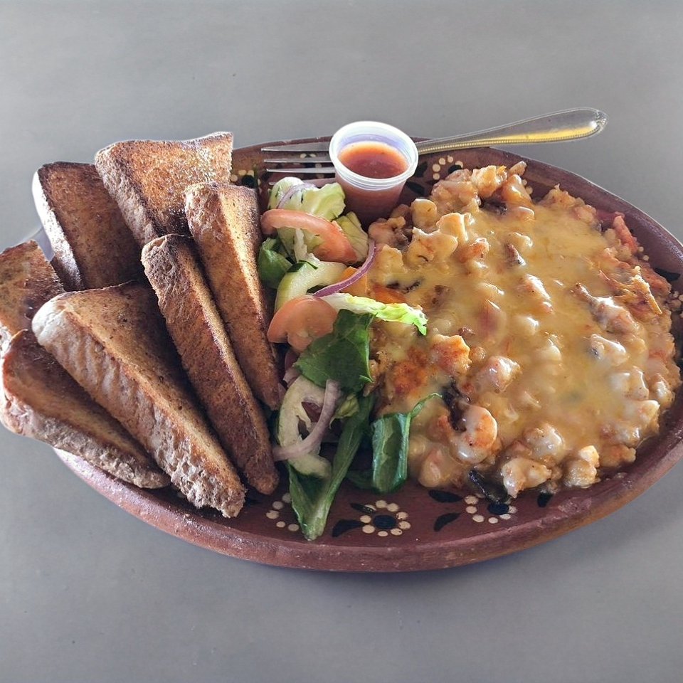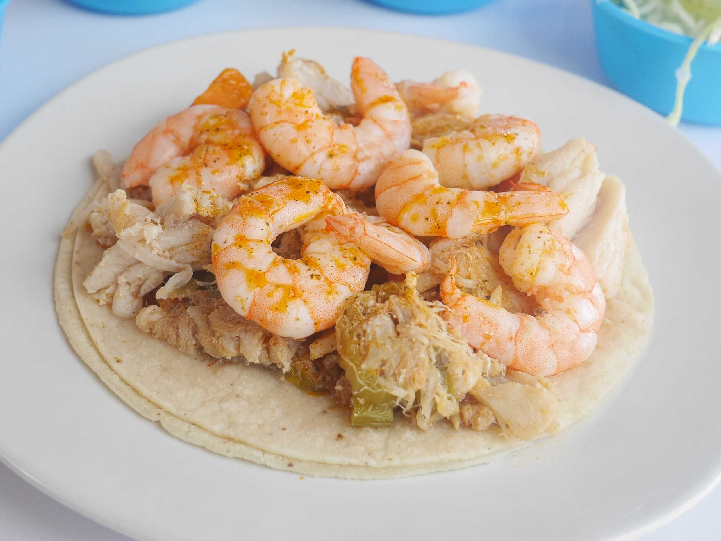 Tortilla de maiz, queso, camarón y ensalada de verduras.