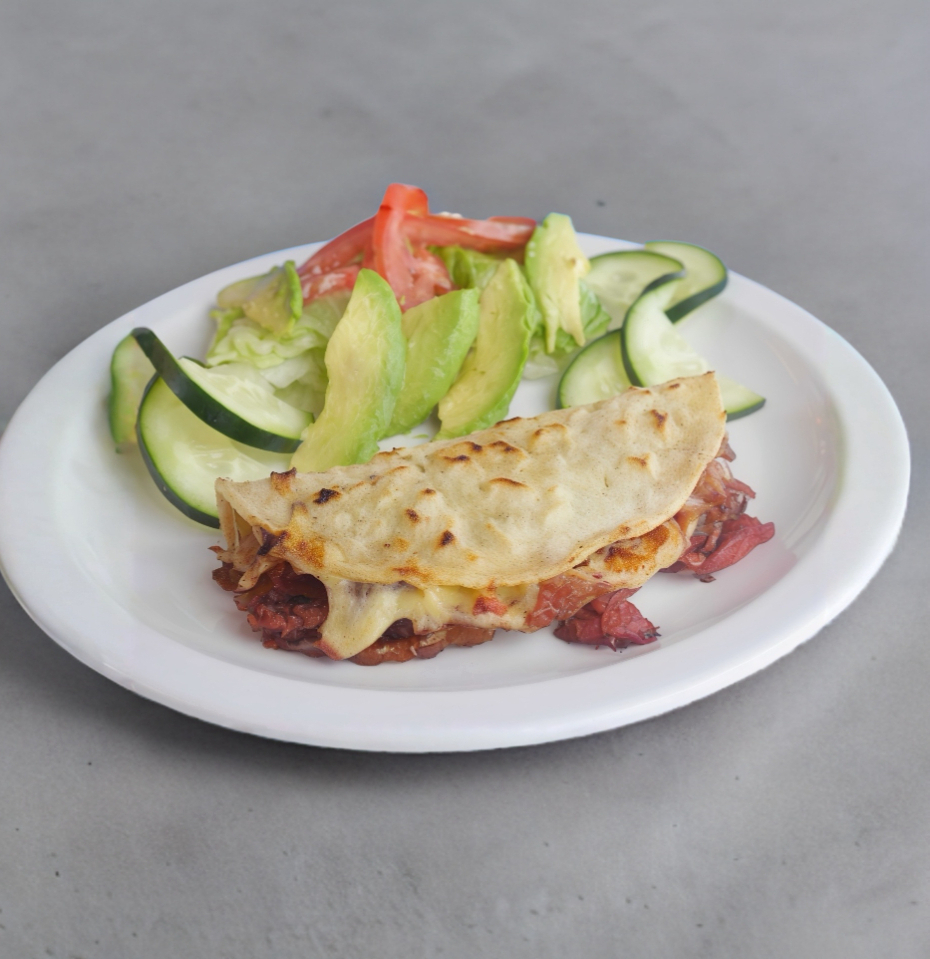 Tortilla de maiz, queso, marlin guisado y ensalada de verduras.
