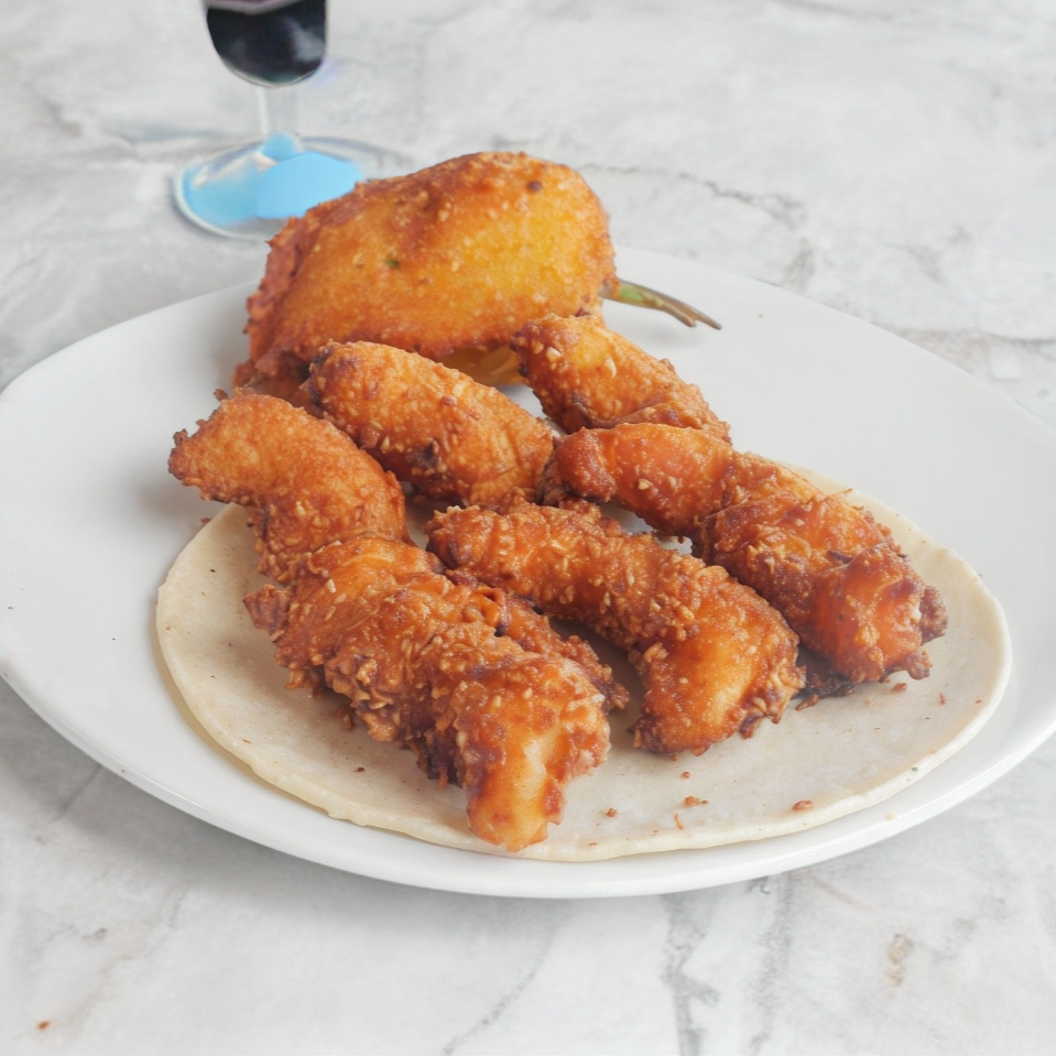 Empanizado, verdura y salsas aparte, salsa bandera, ensalada de repollo, limón, aderezos