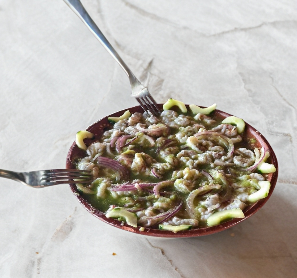 1 Lt Pescado, camarón cocido, pulpo, pepino, tomate, cebolla, cilantro, ligeramente salseado, jugode camarón y clamato.