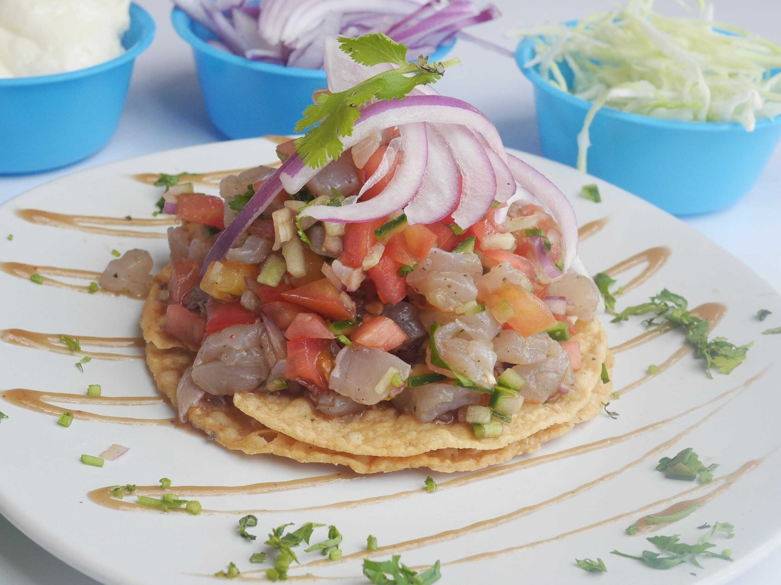 cama de verdura, mayonesa, camaron cocido y callo de lobina, salseado cebolla y serrano