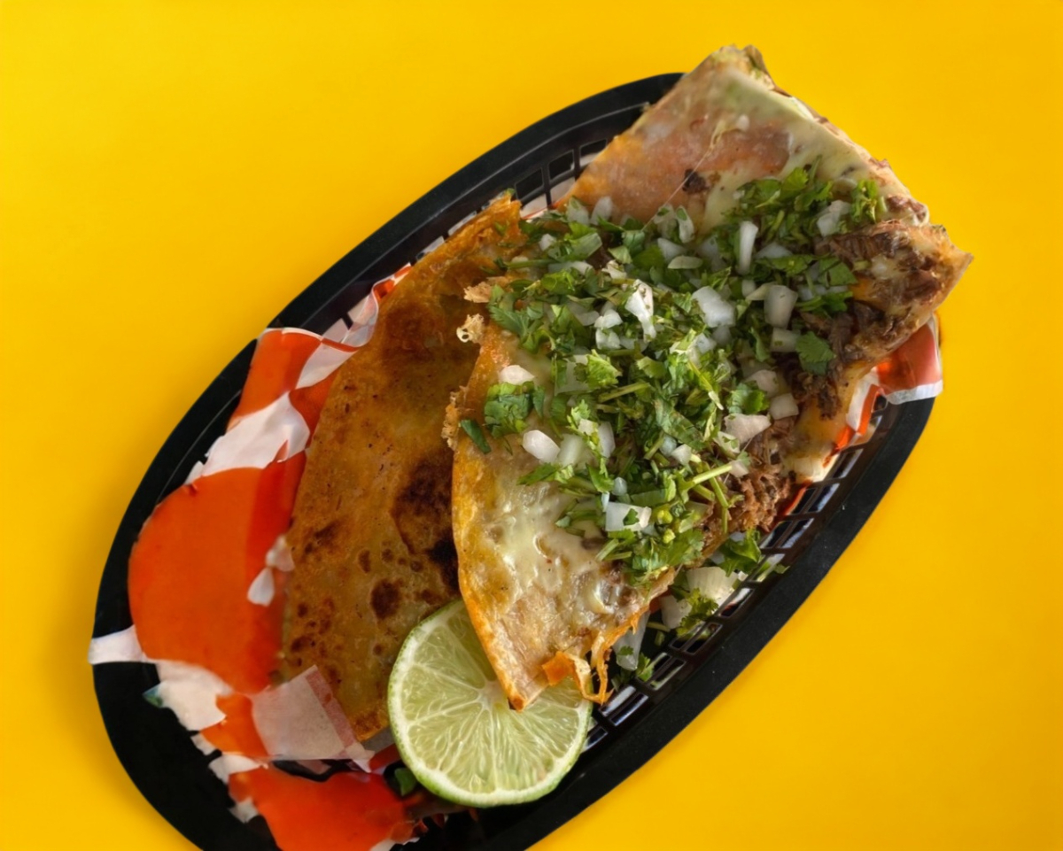 “Quesabirria de harina estilo Tijuana: tortilla grande y suave, rellena con birria jugosa y queso derretido, acompañada de salsa especial.