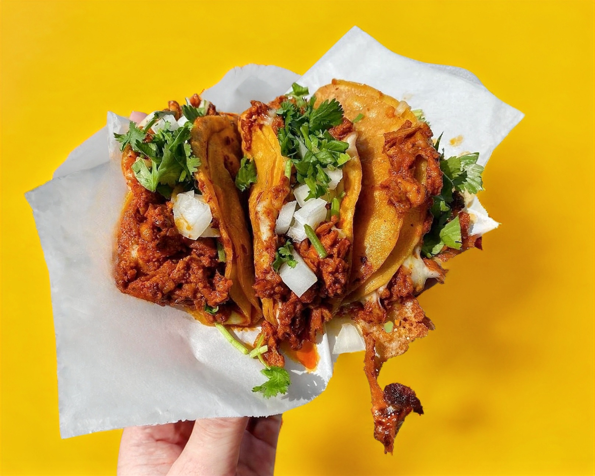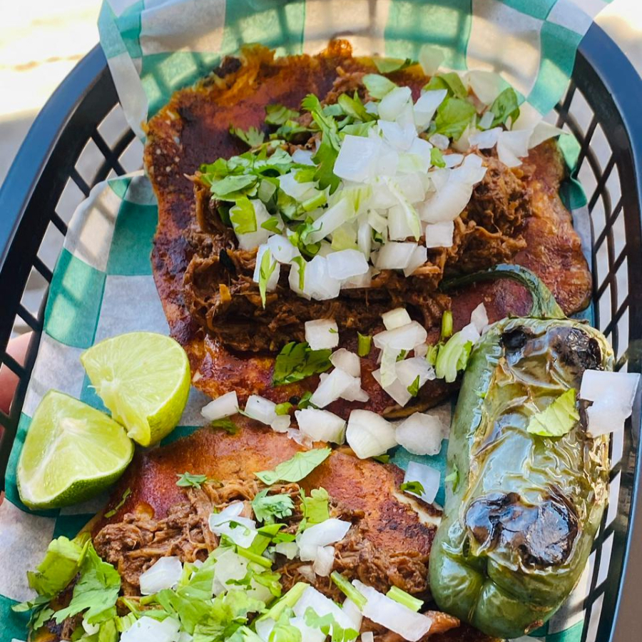 Volcán de birria: tortilla de maíz dorada con birria y queso derretido, cubierta con más queso y salsa especial, creando un ‘volcán’ de sabor que se disfruta con cada bocado.”