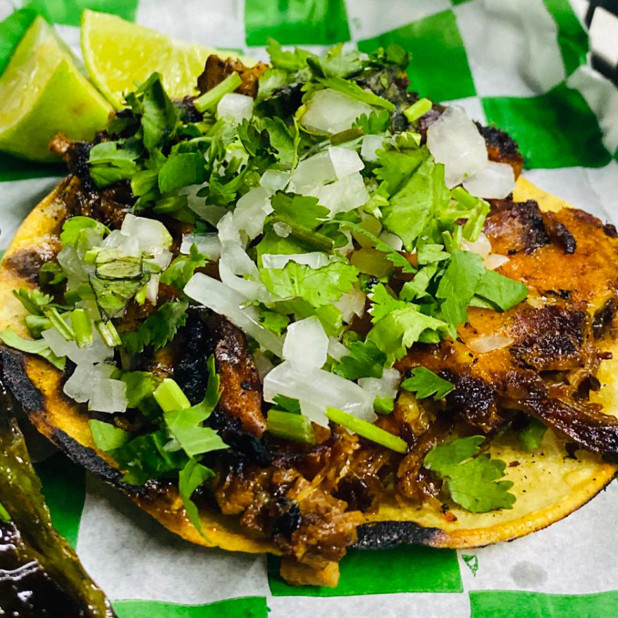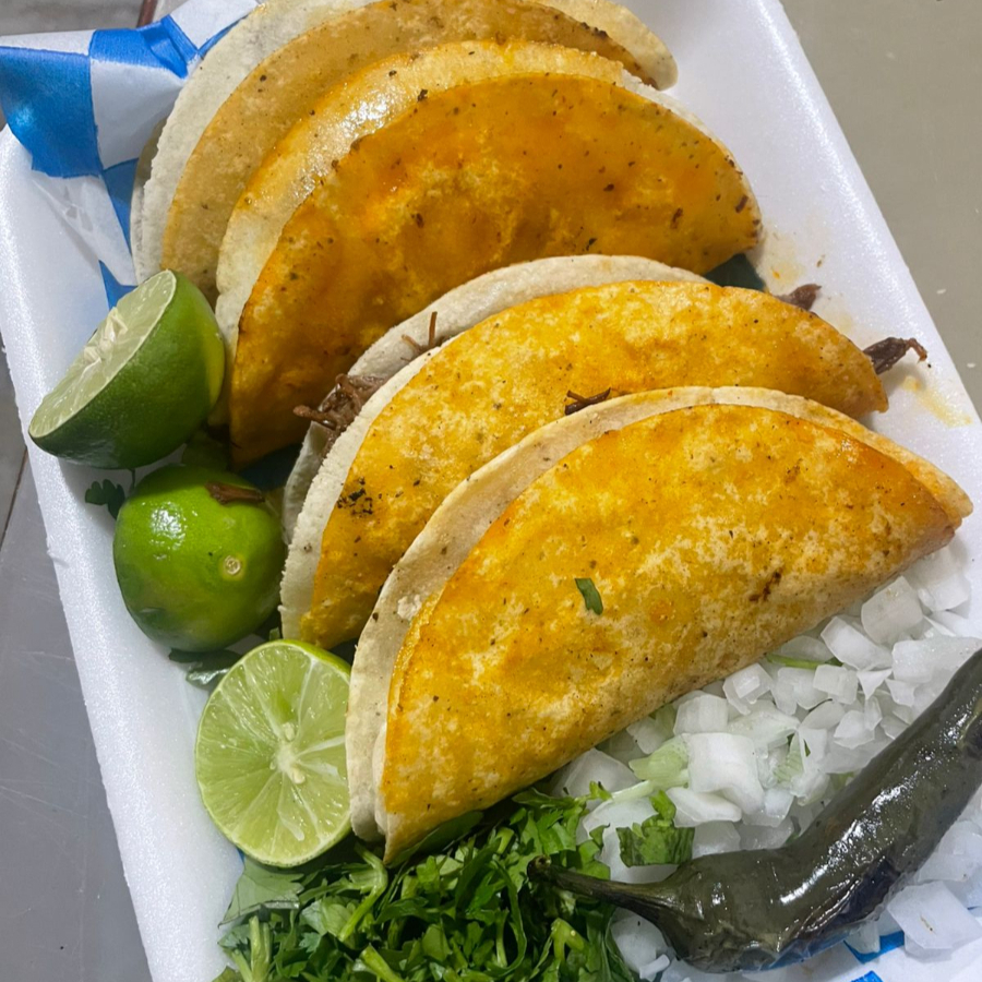 “Taco de birria recién hecho: jugosa carne de birria en tortilla de tu elección (maíz o harina), servido con salsa al gusto.