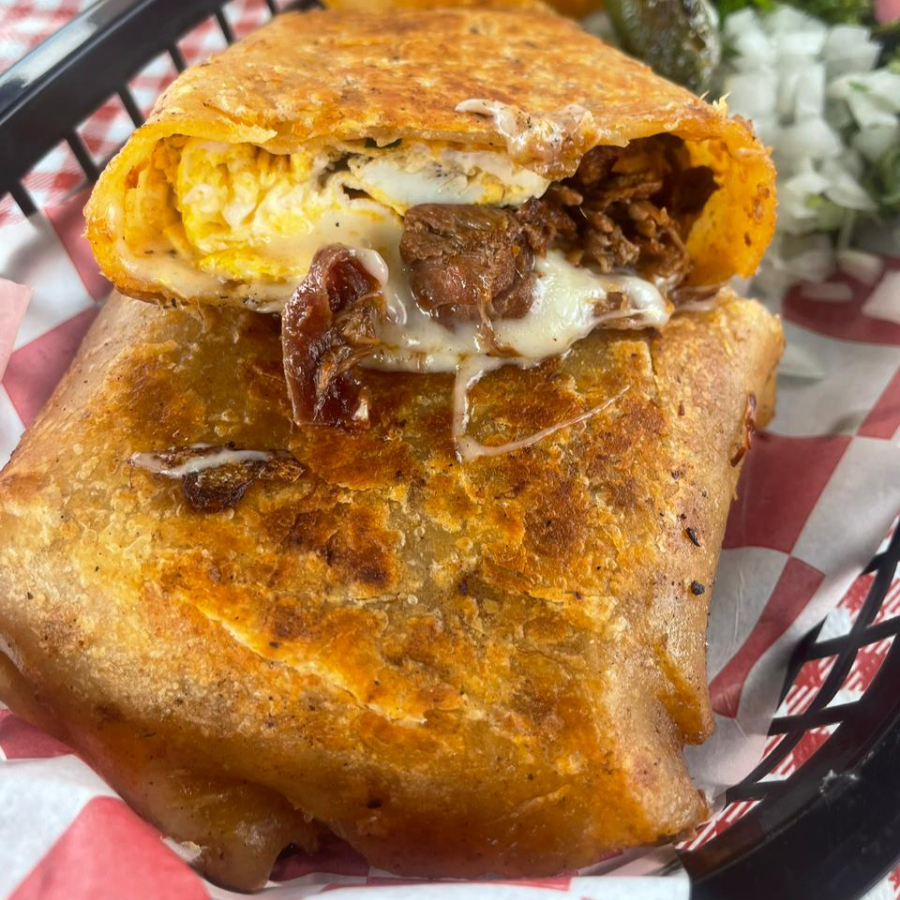 Tortilla de harina rellena con birria suave, huevo revuelto y queso fundido, doradito por fuera y con ese sabor que solo Los Aguirre sabe dar.