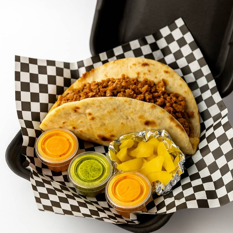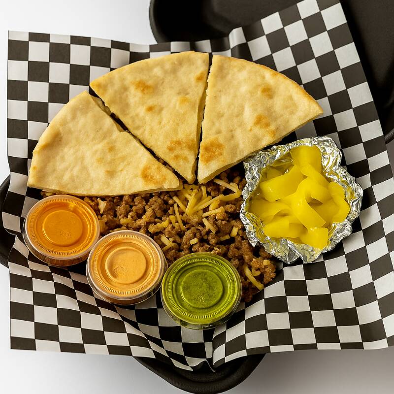 Un pan pita crujiente, quebrado en cuatro pedazos pa’ que agarres fácil, montado sobre una cama de carne árabe jugosita con queso picadito sin derretir (al estilo norteño, pa’ sentir el bocado completo 🤤). Viene con sus salsitas bravas (verde Yala, roja Habibi y la Sahara picosita), más sus cebollitas en mostaza pa’ rematar con todo el sabor árabe-mexa que tanto nos caracteriza.