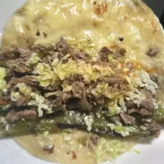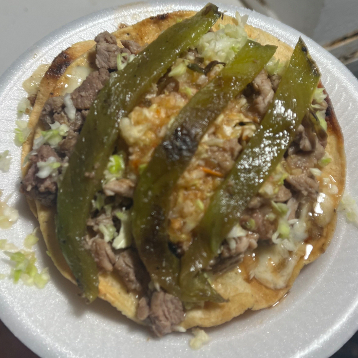 Tortilla de maíz dorada, queso gouda gratinado, sirloin asado a la plancha, chile verde tatemado,repollo y jugo de tomate, acompañado de cebollita asada, rábano, pepinos, zanahorias, guacamole, chiles toreados, y salsa tatemada de la casa..
