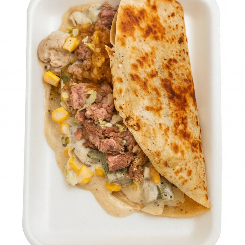 Tortilla de harina casera, queso gouda, chile verde tatemado, sirloin asado a la plancha, repollo y jugo de tomate acompañado de cebollita asada, rábano, pepinos, zanahorias, guacamole, chiles toreados, y salsa tatemada de la casa.