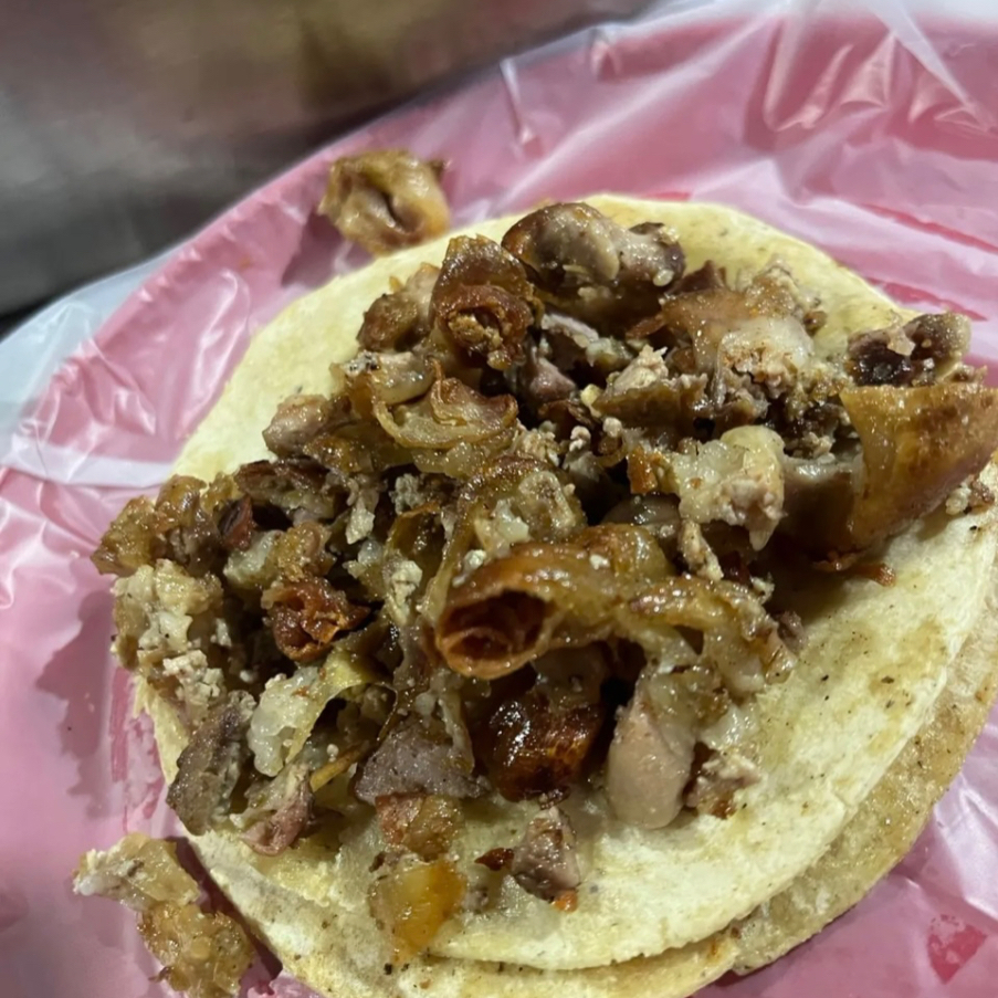 Deliciosa tripa de res doradita, repollo y jugo de tomate, acompañado de cebollita asada, rábano, pepinos, zanahorias, guacamole, chiles toreados, y salsa tatemada de la casa..