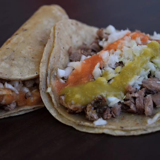 Tortilla de maíz dorada, sirloin asado a la plancha, repollo y jugo de tomate, acompañado de cebollita asada, rábano, pepinos, zanahorias, guacamole, chiles toreados, y salsa tatemada de la casa.