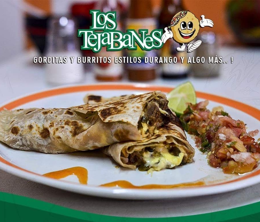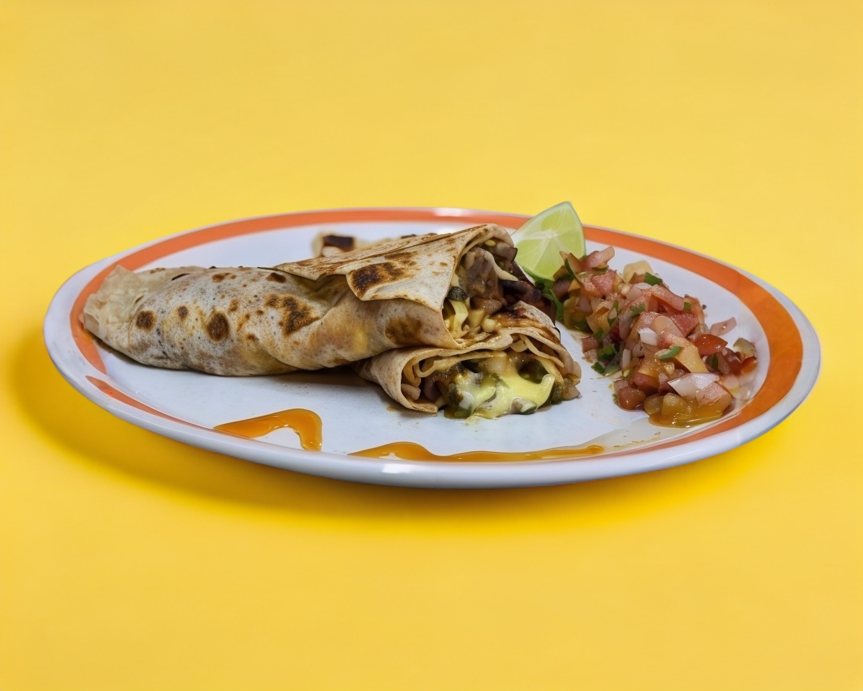 Tortilla de harina 100% casera relleno de carne asada, frijol, rajas y queso.