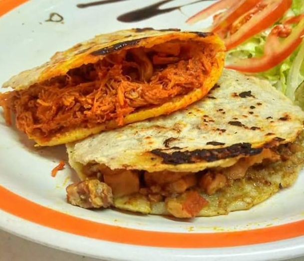 Gordita con guiso a escoger, asientos, queso gratinado, cebolla y cilantro.