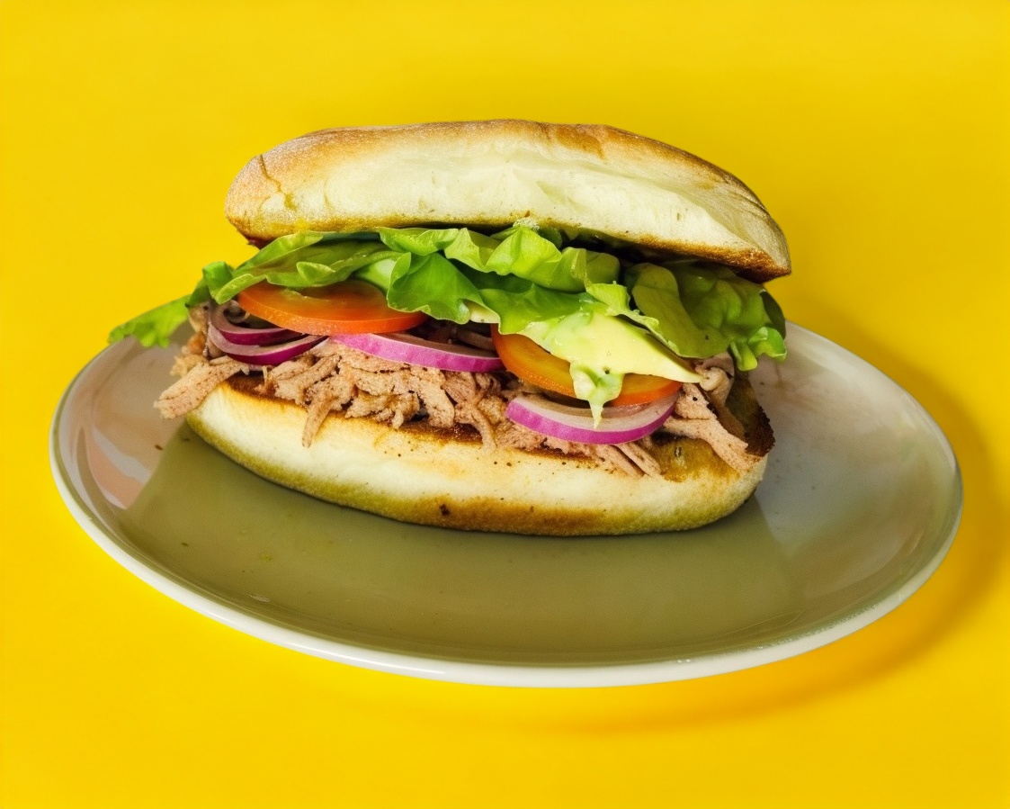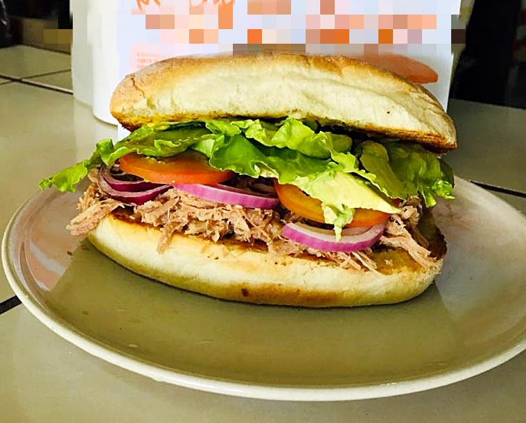 Pan telera, cochinita de puerco, lechuga, tomate, aguacate y acompañada de papas.