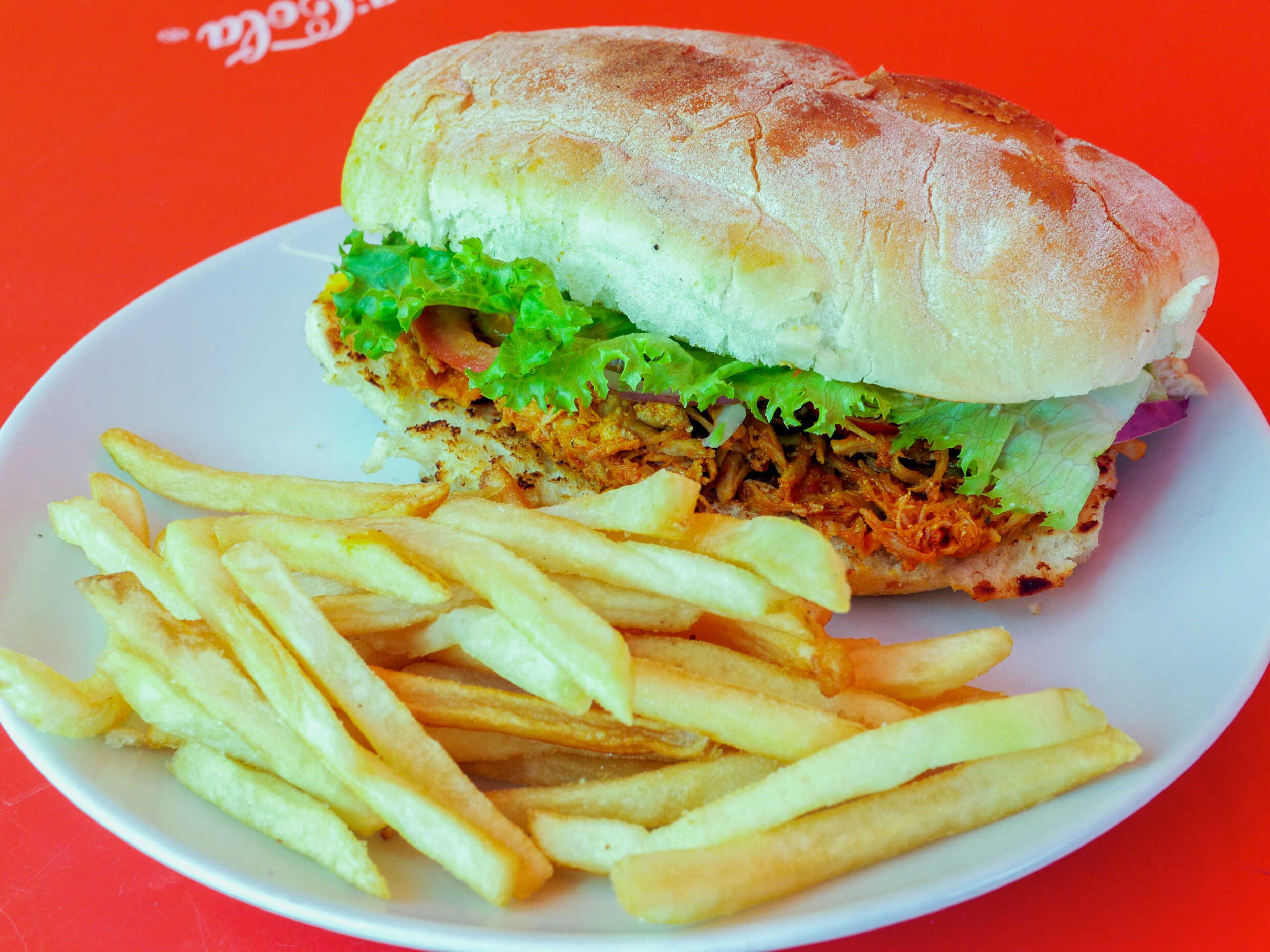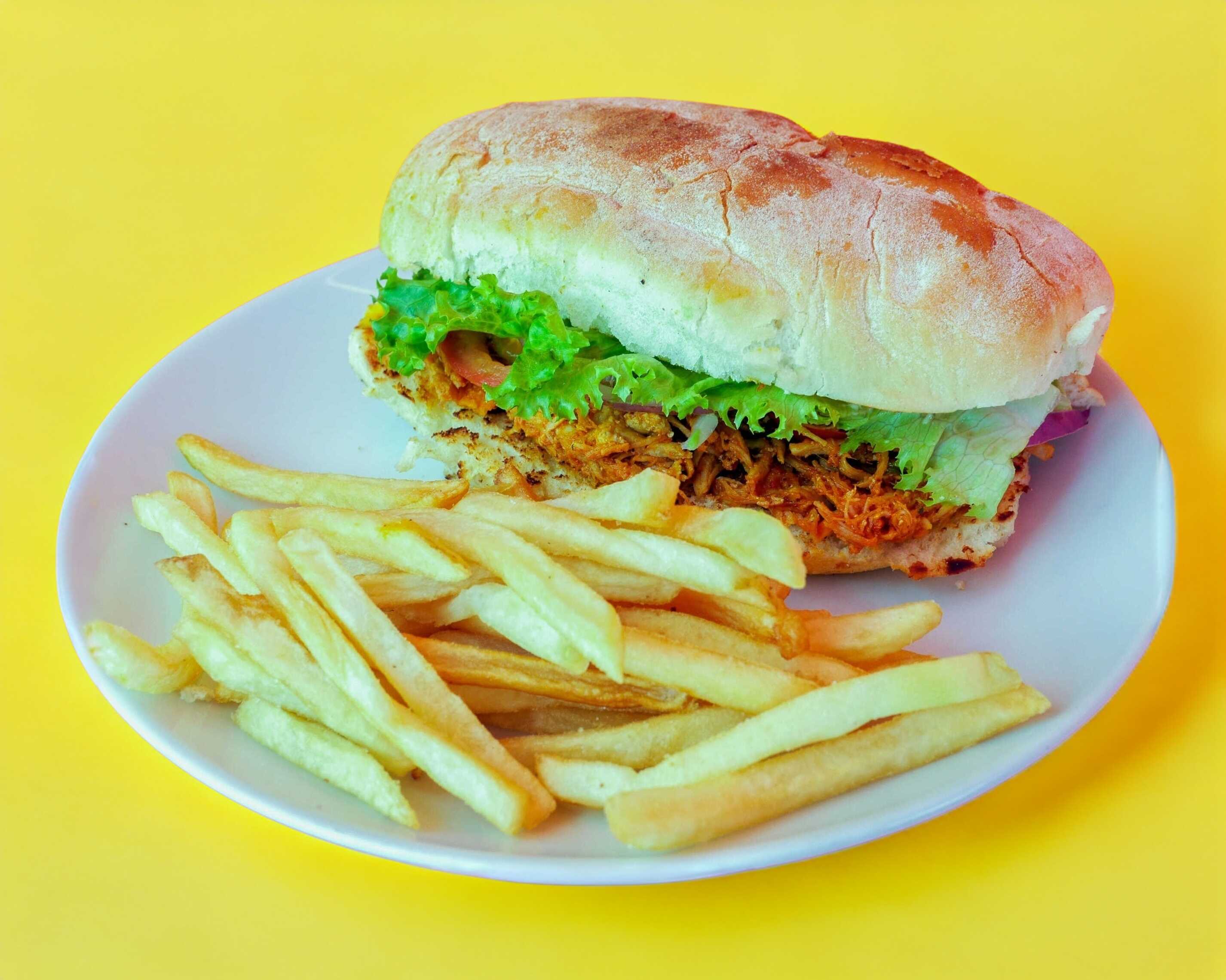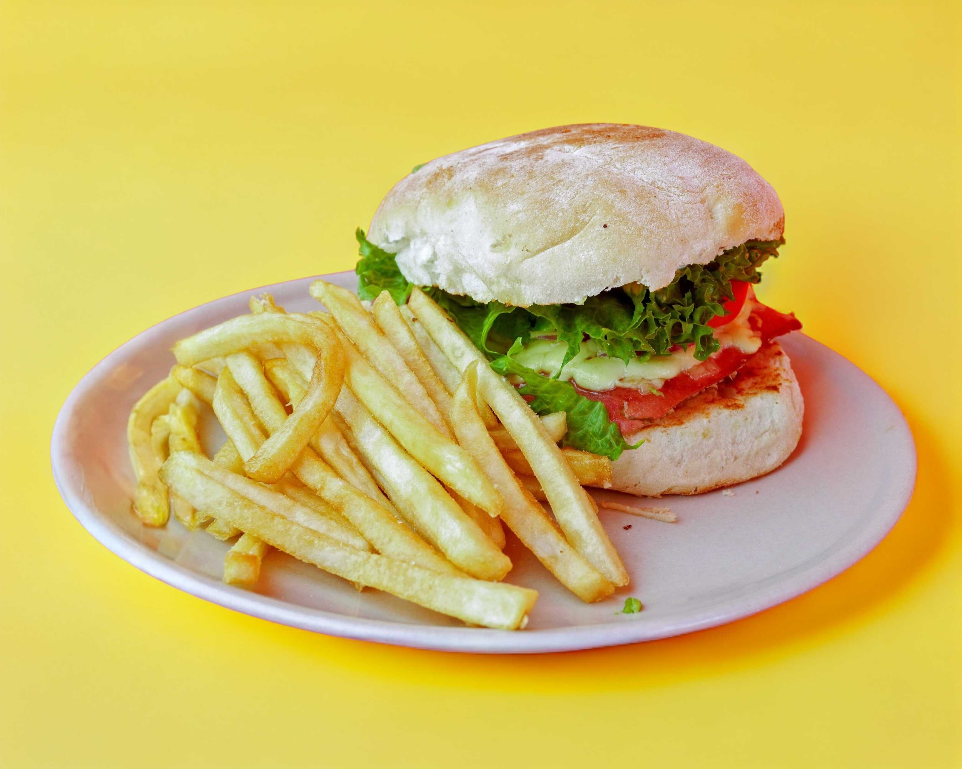 Pan integral, pechuga de pollo, lechuga italiana, tomate, cebolla, aguacate, y papas fritas