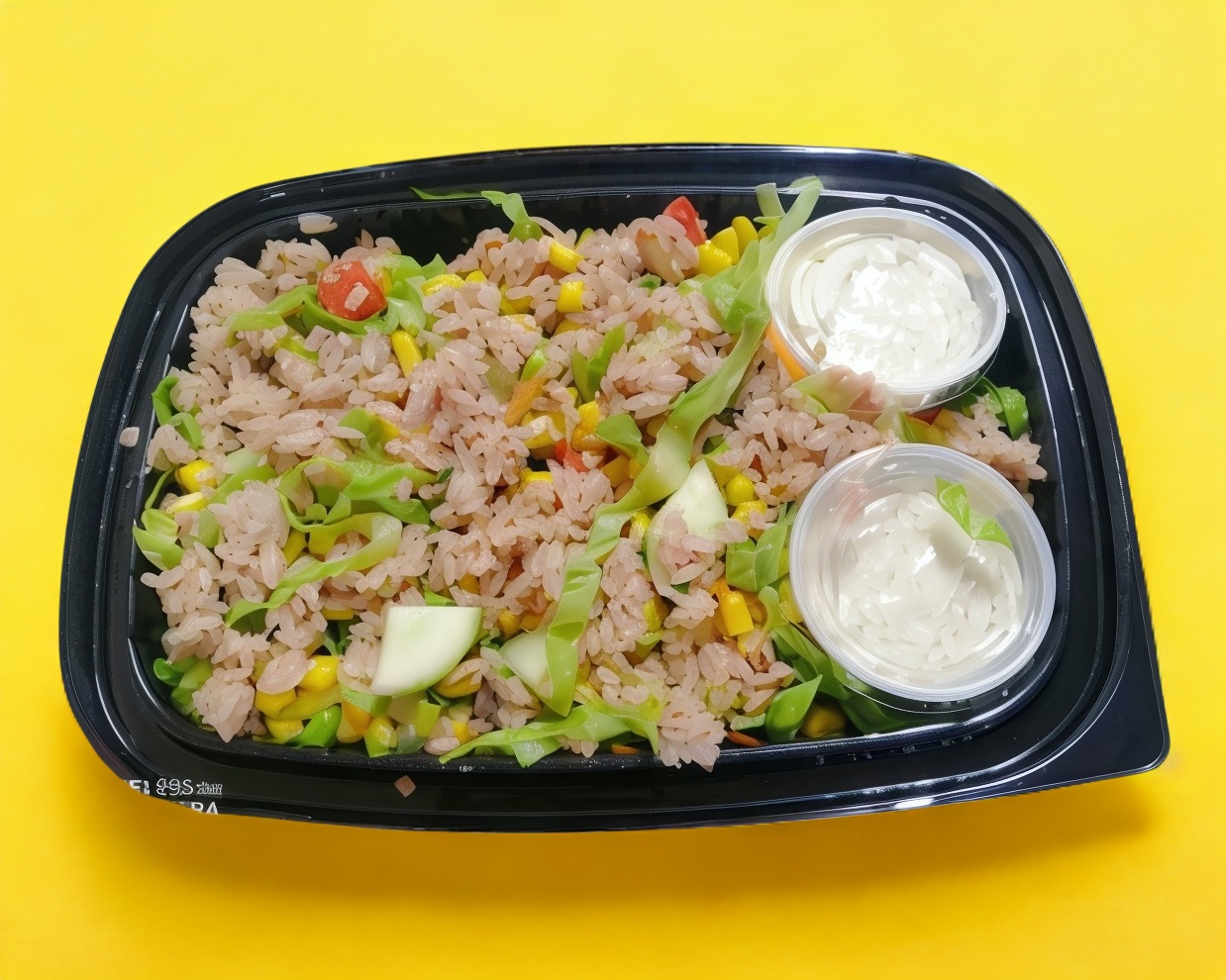 Ensalada fresca con pollo cocinado a la plancha, contiene lechuga, tomate, pepino, zanahoria, jamón, queso de rancho, tritones y aderezo ranch.