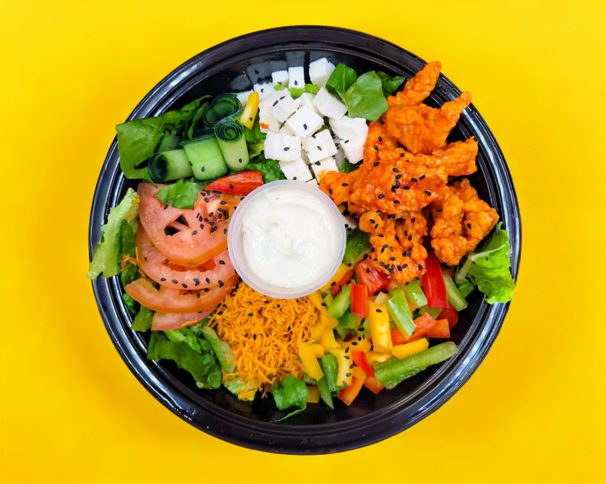 Deliciosa exploción de Sabor. Elige la Salsa para tus boneless de preferencia, Queso Feta, tomate, mix de pimientos, zanahoria frita y pepino.