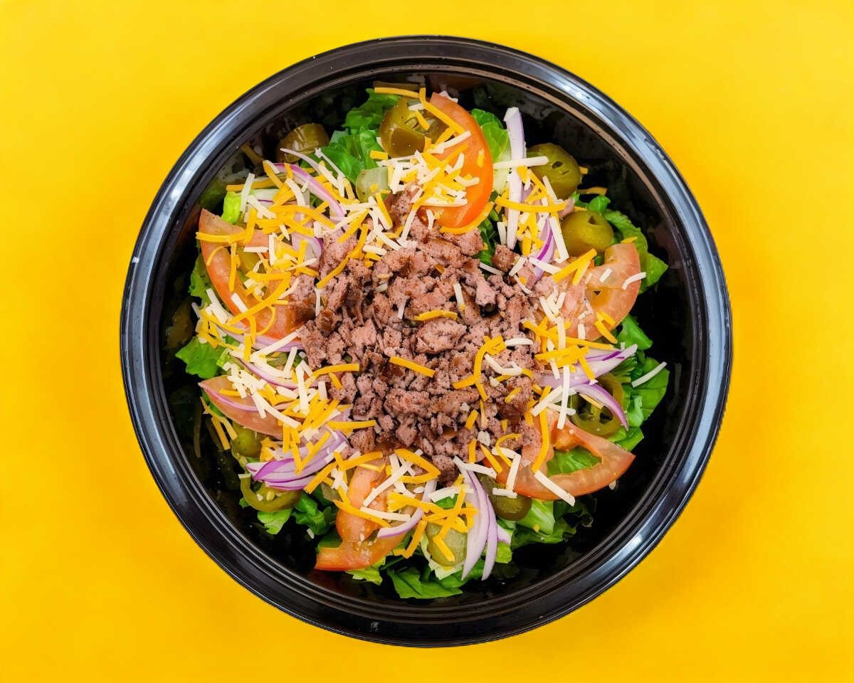 Imagina tu Burguer Favorita echa ensalada. Base de Lechuga, Carne triple molido Sirloin, pepinillos, jalapeño, tomate, mix de queso chedar y cebolla morada.
